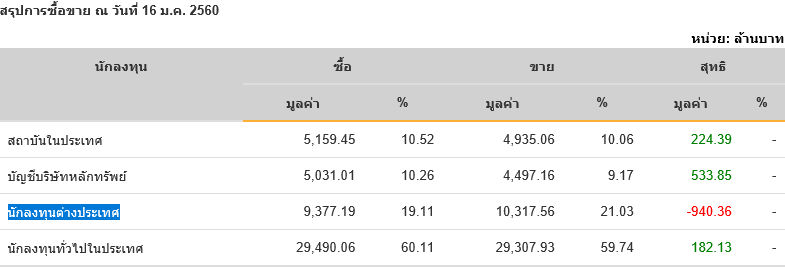 Sinthorn Summary 16/1/2560 : ต่างชาติขายสุทธิ -940.36 ลบ.