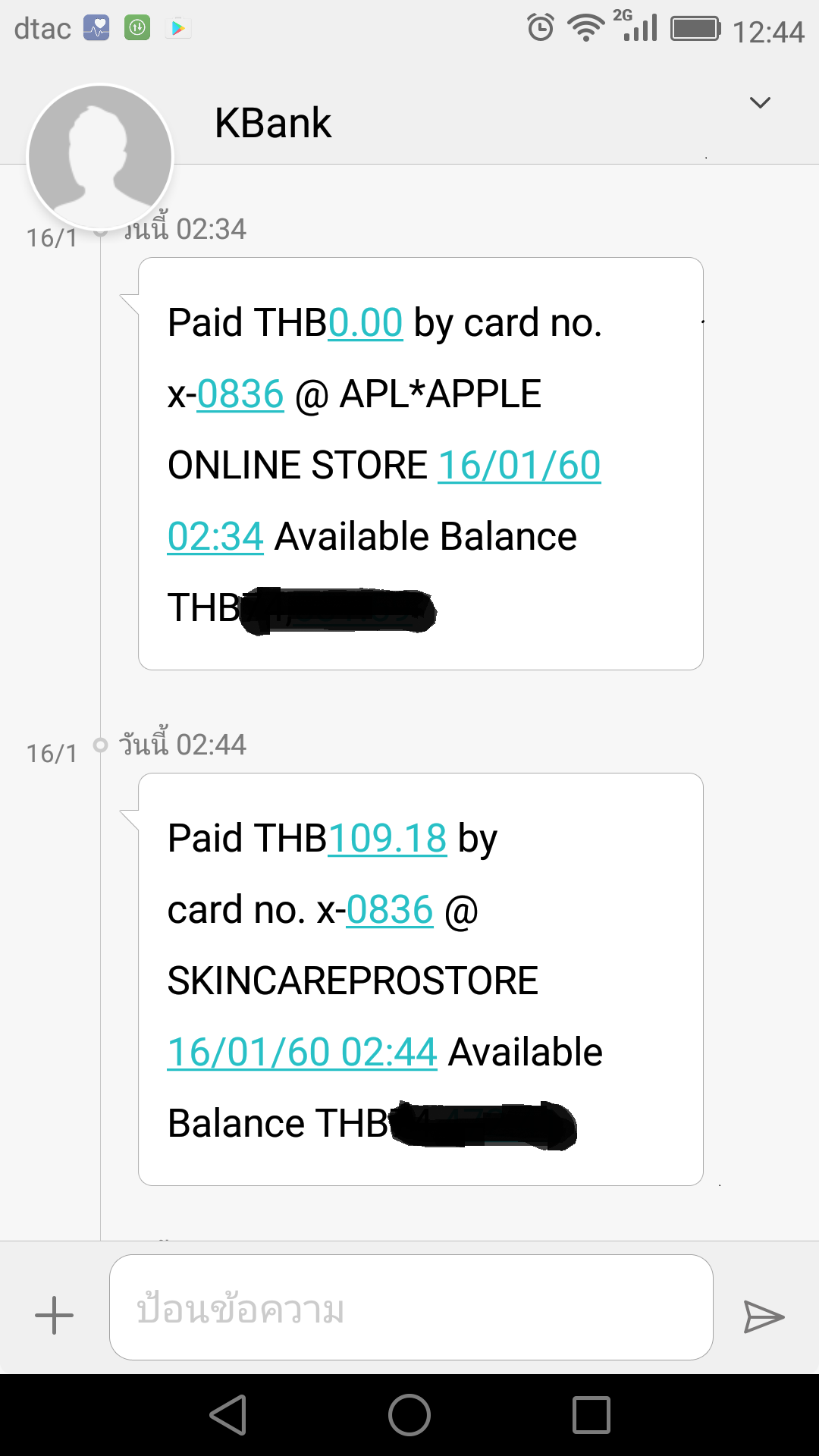 เมื่อวันที่ 16/1/60 เวลา 2.34 น. มีข้อความจากธนาคาร แล้วเวลา 2.44 น. มีแจ้งยอดการใช้จ่ายจาก SKINCAREPROSTORE ยอด 109.18 บาท