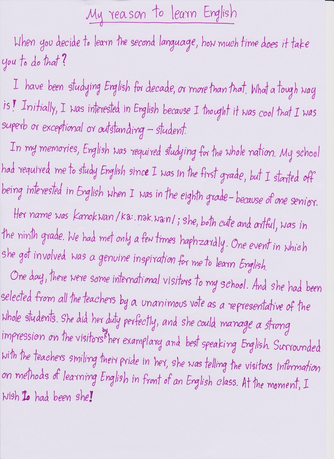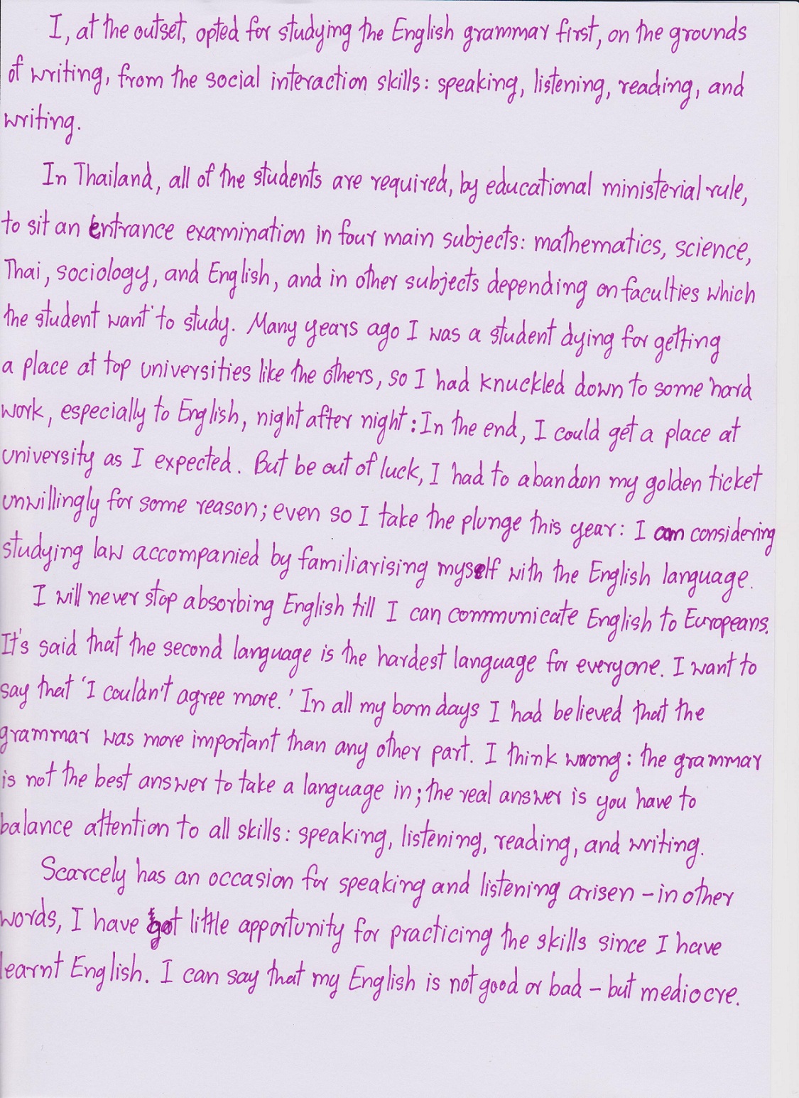 2.) งานเขียนชิ้นนี้ผมต้องใช้เวลา 3-4 วัน ซึงนานมากนะสำหรับผม มันแค่ 2 หน้ากระดาษครึ่งเองครับ ปัญหาหลักของผมคือ ผมต้องเปิดดิทบ่อยโครตตตตตตตต ( I'm always consulting dictionaries when I write an English essay. ) คือแบบ เปิดจนเหนื่อย แต่ก็ไม่เคยยอมแพ้นะครับ ใจผมมันรักที่จะเขียน แต่ผมอยากทราบว่าพอมีวิธีไหนบ้างครับที่ผมสามารถนำไปฝึกได้จนกระทั่งผมสามารถเขียนภาษาอังกฤษได้อย่างถูกต้อง สวยงาม จนไม่ต้องเปิดดิทบ่อยขนาดนั้น แบบเขียนได้คล่องไม่ต้องกังวลอะไรให้มากมาย เหมือนตอนที่ผมอยากเขียนอะไรก็ได้ ที่ผมอยากเขียนในภาษาแม่ผม ในภาษาไทย