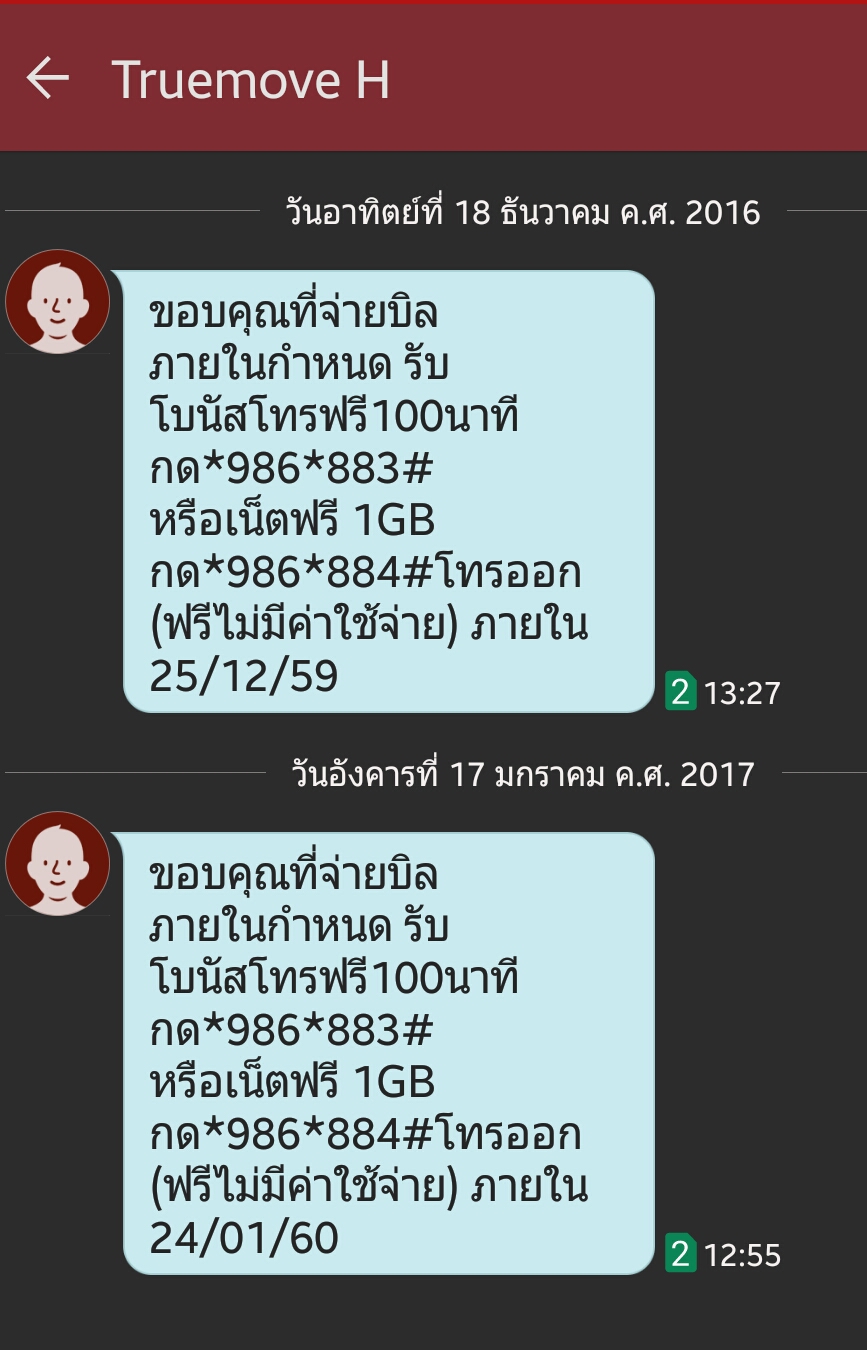 TRUE ทวงค่าโทรศัพท์ผ่านเมสเสจ รัว 2 เมสเสจเลย กำหนดชำระค่าโทร.วันที่ 25 ต.ค.56 แต่ส่งเมสเสจมาทวงตั้งแต่วันที่ 8 ต.ค.56 ใบแจ้งหนี้ก็ยังไม่ส่งมาเลย จะเมสเสจมาทวงหาอะไร