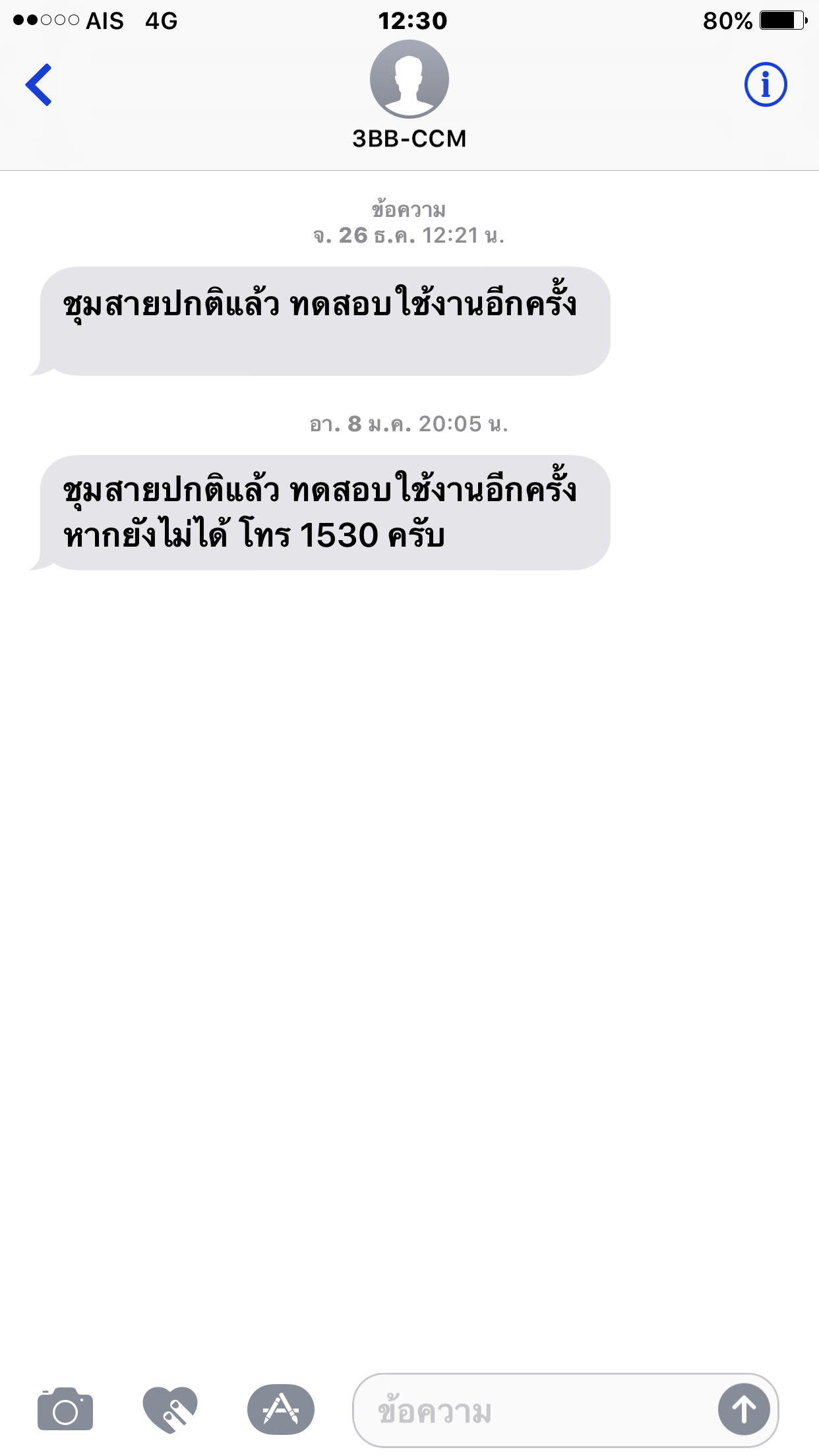 โทรแจ้งเจ้าหน้าที่ ได้รับคำตอบว่า เครือข่ายมีปัญหาในบริเวณนี้ใช้ไม่ได้ทั้งหมด(ผมอยู่แถวลำสาลี) ทำอะไรไม่ได้ได้แต่รออย่างเดียว ผมเริ่มไม่พอใจใช้ได้2เดือนมีปัญหา 3ครั้งแล้ว และต้องเสียเวลาหลายครั้งจ่ายรายเดือนก็จ่ายเต็ม พนง.เลยแจ้งว่าจะลดค่าบริการให้