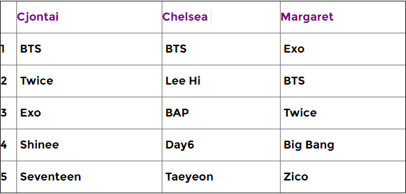 ดูจากลิสท์ของพวกเราแล้ว ฉันว่ามันดูย้อนแย้งดีที่ขณะที่ฉันเป็น EXO stan แต่ฉันกลับไม่ได้เลือก EXO ให้ติดในลิสท์ ขณะที่คุณสองคนเลือกพวกเขา ฉันอยากรู้ว่าอะไรคือสาเหตุ