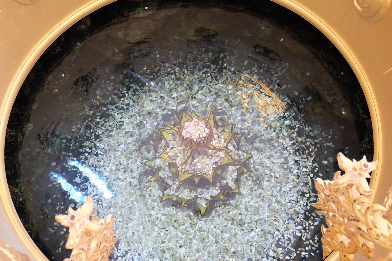 จุดนี้เป็นจุดที่มีคนเยอะพอสมควรเลย เพราะแต่ละคนก็จะมาโยนเหรียญอธิฐานตามความเชื่อว่า ถ้าโยนเหรียญที่อธิฐานลงไปตรงกลางได้จะถึงว่าพรที่อธิฐานนั้นจะสำเร็จ เลยมีคนมาที่จุดนี้เยอะเป็นพิเศษ เพราะถ้าโยนแล้วไม่ลงดอกบัวตรงกลางก็จะยืนโยนใหม่ อยู่แบบนั้นเหรียญแล้วเหรียญเล่า (ง่ายๆคือโยนกันจนกว่าจะลงอ่ะ) ดูจากเหรียญที่อยู่รอบนอกก็น่าจะพอเดาออกออกว่าเยอะมากแค่ไหน