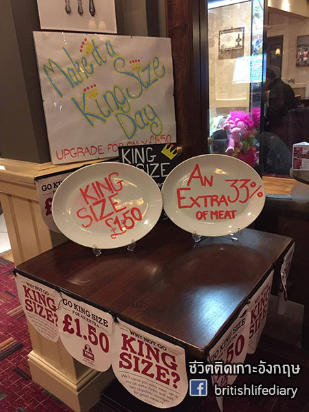 เข้าไปปุ๊บ จะเจอโปรโมชั่นยั่วยวนใจ กับการอัพเกรดจานอาหารให้เป็นแบบ King size ซึ่งหมายถึงเราจะได้เนื้อเพิ่มมากขึ้น ได้ Yorkshire pudding เพิ่มมากขึ้น และได้ไส้กรอกพิเศษอีกด้วยค่ะ แต่ตั้งแต่เรามาทานที่นี่ ยังไม่เคยลองเลยค่ะ แค่จานปกติก็ทานแทบไม่หมดแล้ว
