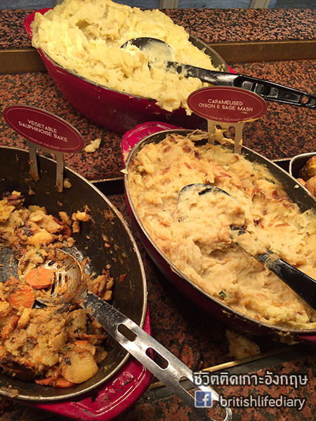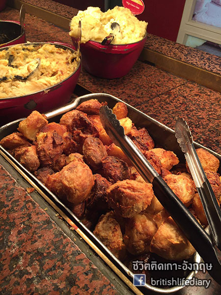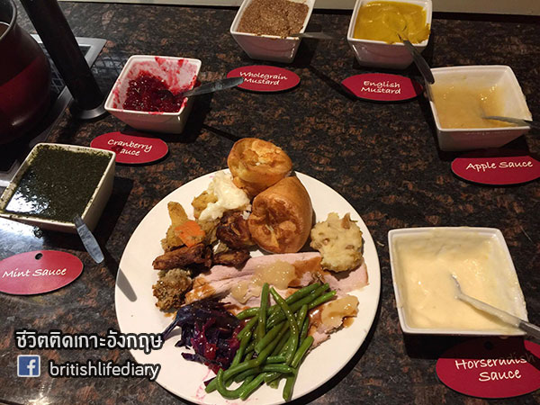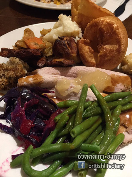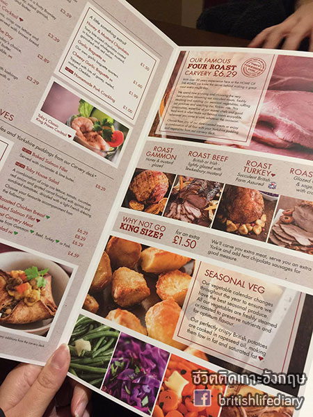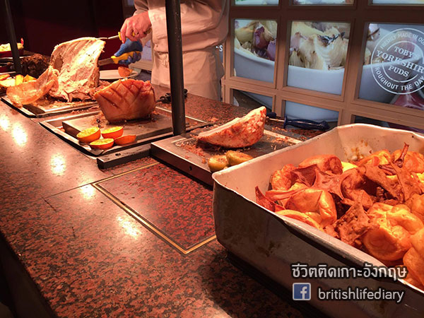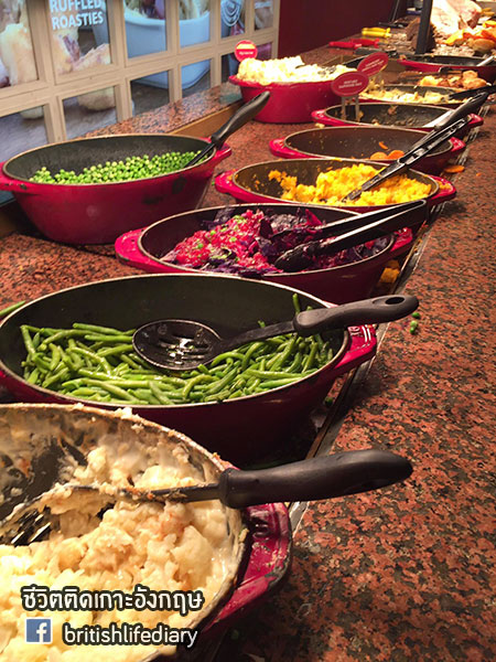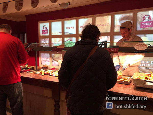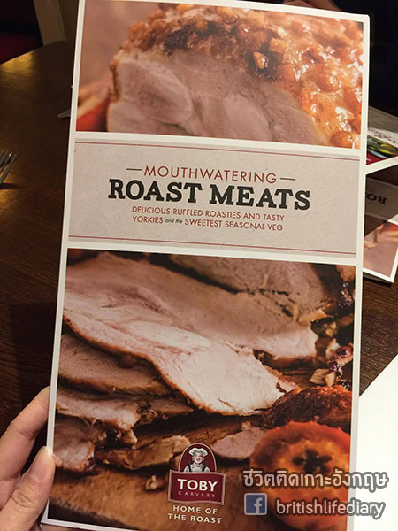 ร้านนี้มีชื่อว่า Toby Carvery ค่ะ คำว่า carvery นี่หมายถึงร้านอาหารที่เสิร์ฟเนื้อชนิดต่างๆ แบบหั่นสไลซ์แล้วเสิร์ฟให้ลูกค้าเดี๋ยวนั้นตอนนั้นค่ะ บางทีก็จะมีบริการแบบบุฟเฟ่ต์ด้วย แต่ในส่วนของร้านที่เราจะพาไปชมวันนี้ ตัวเนื้อเป็นแบบไม่บุฟเฟ่ต์นะคะ แต่ว่าเครื่องเคียง หรือที่เรียกว่า trimmings นั้น มีให้ไม่อั้นค่า