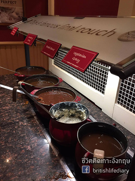 เสร็จแล้วก็มาเลือกเกรวี่กันค่ะ มีหลายแบบมาก ทั้งแบบปกติ แบบมังสวิรัติ มีซอสชนมปังด้วย เราเคยลองแล้วรสชาติหยึยๆเหมือนโจ๊กผสมซีรีแล็กยังไงไม่รู้ ขอผ่านค่ะ
