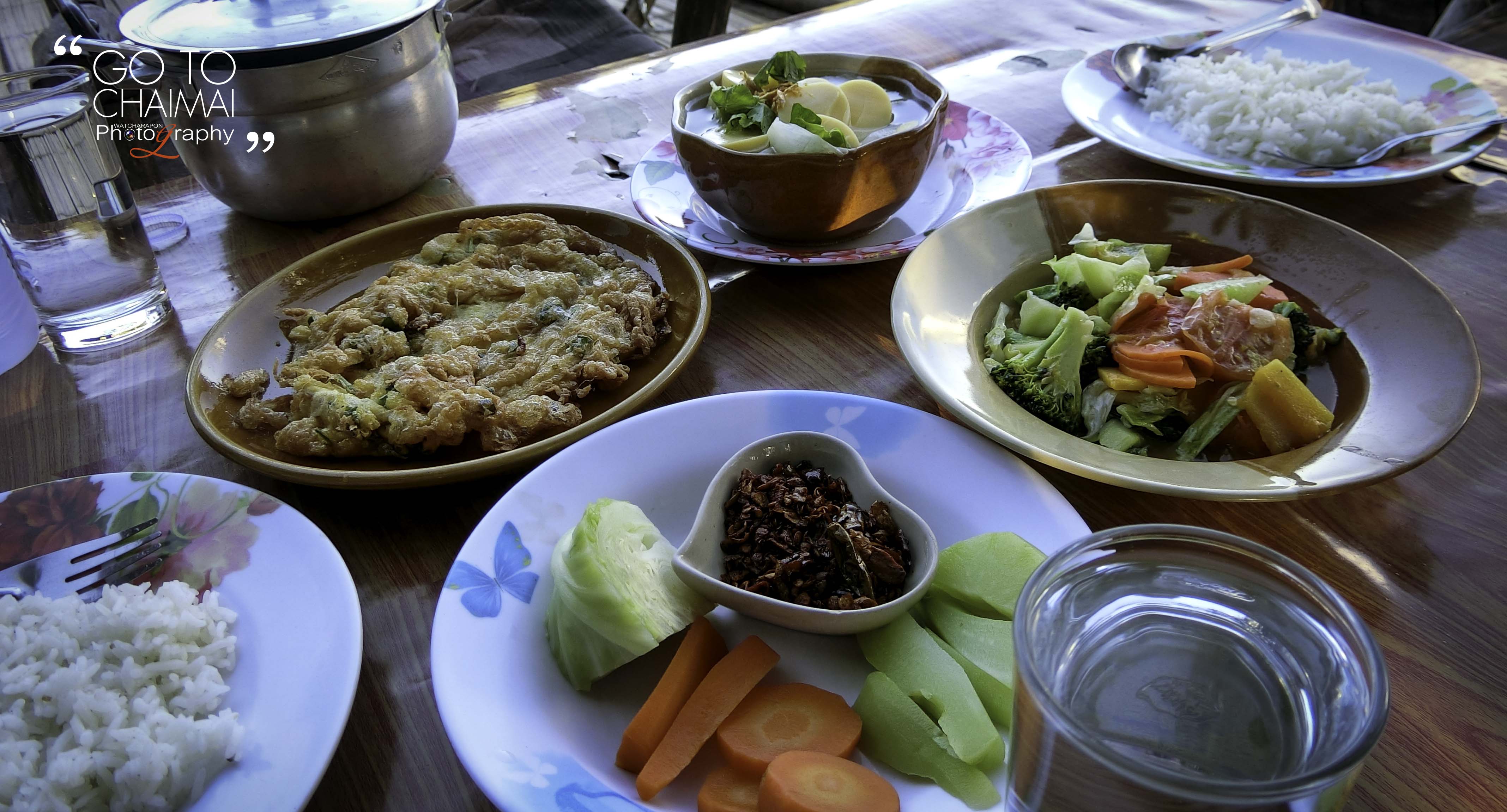 อหารเย็นจะมี ผัดผัก ไข่เจียวหมูสับ ต้มจืด และน้ำพริกผักลวก