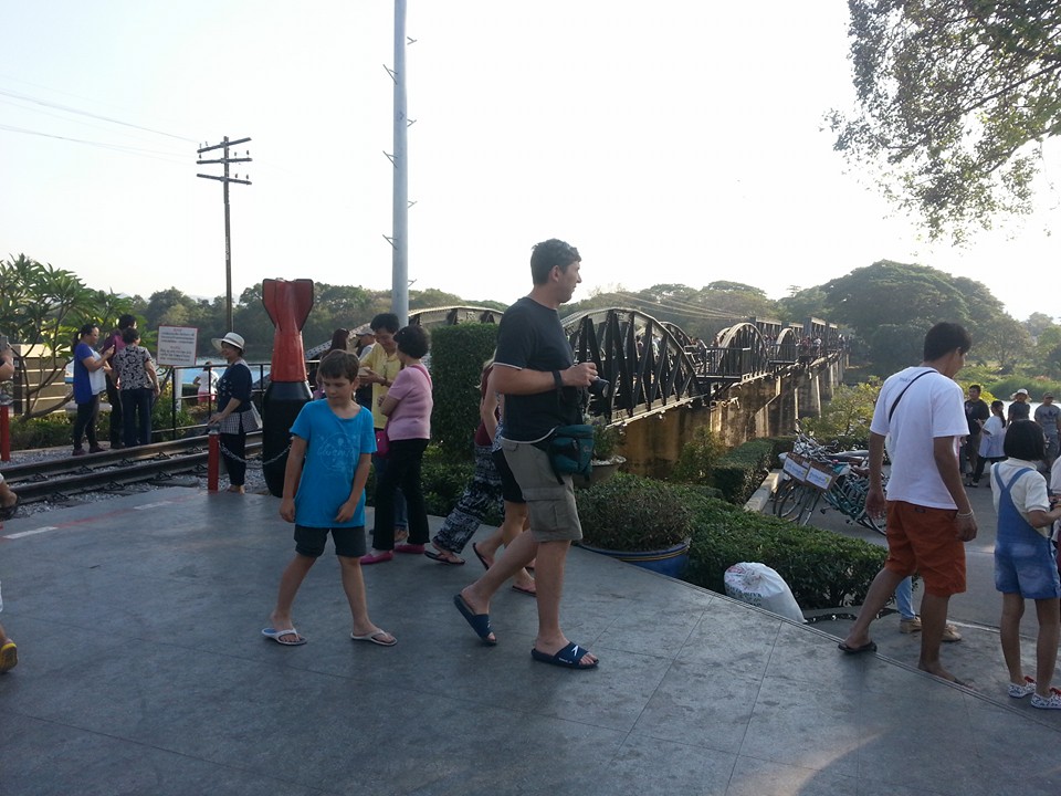 สะพานข้ามแม่น้ำแควครับผม คนเยอะมากนะครับ เป็นเส้นทางแห่งประวัติศาสตร์ด้วยนะครับ ไม่อยากจะคิดว่าที่นี้เกิดสงครามโลกครั้งที่ 2 ขึ้น ผมอ่านป้ายประวัติได้ใจความว่า ที่จริงแล้วชื่อสะพานข้ามแม่น้ำแคว เพิ่งมาเปลี่ยนชื่อในตอนหลัง เพราะมีคนอังกฤษนำไปถ่ายทำภาพยนต์ ก็เลยตั้งชื่อให้ตรงกับในภาพยนต์ แล้วก็มีนักท่องเที่ยวมาตามหามากมาย ก็เลยกลายเป็นแหล่งเศรษฐกิจไปเลย ย้าฮู้ววว