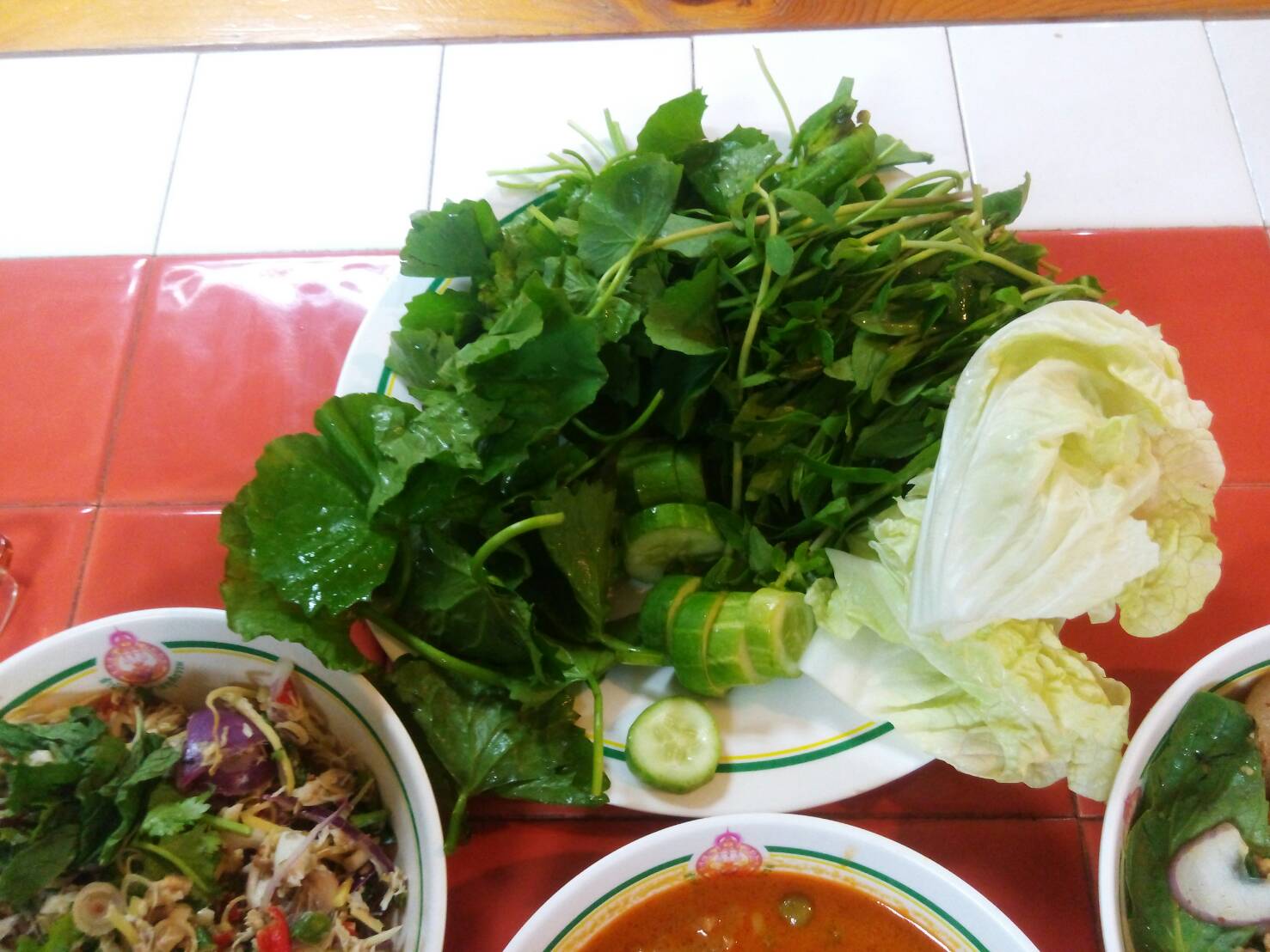 ก็สั่งแบบกินเล่นๆ แต่สั่งไปสั่งมาก็อีหรอบเดิม เต็มโต๊ะ แทบทุกร้านมีผักให้ตักเอง(ใบบัวบก กับ แตงกวา) กินผักเยอะเลย