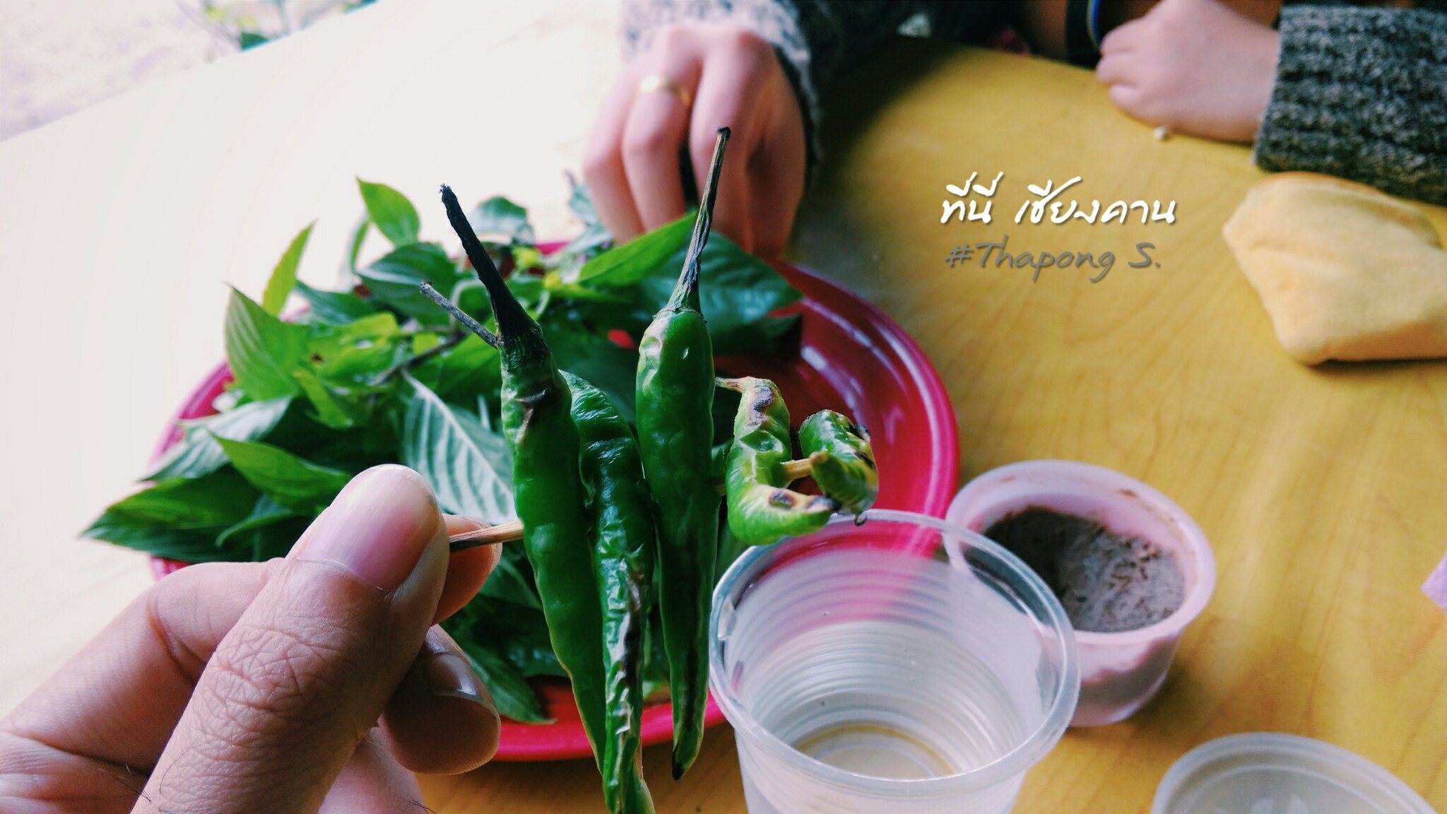 บนโต๊ะมีถั่วฝักยาวกับพริกย่างไว้ให้จิ้มกะปิกินเล่นด้วยแฮะ แปลกดีไม่เคยเจอ