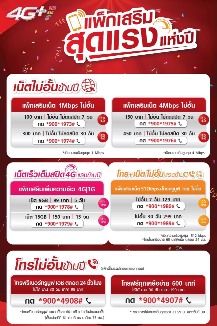 พ็กเกจเสริม เน็ตไม่อั้น 30Mbps + โทรทุกเครือข่าย 30วัน, ค่าบริการ 350 บาท (รวมภาษี),แบบต่ออายุอัตโนมัติ 30 วัน, โทรทุกเครือข่ายนานสูงสุด 15 นาที/ครั้ง นาทีที่ 16 เป็นต้นไป คิดค่าบริการส่วนเกิน 0.99บาท