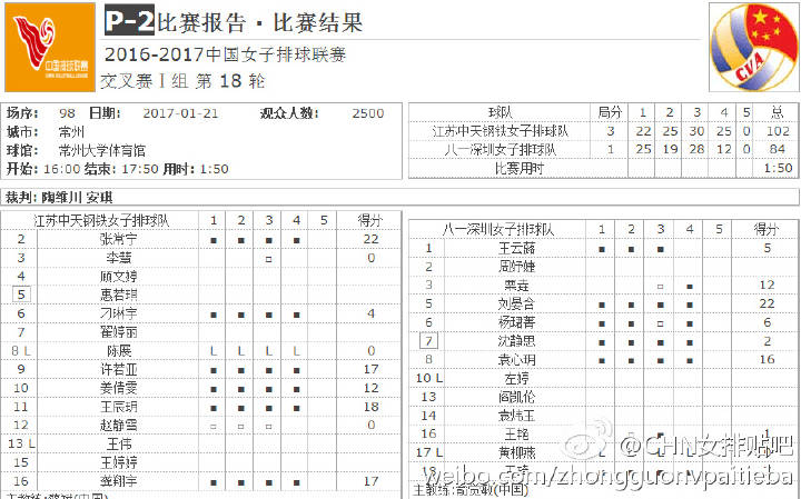 ผลวอลเลย์บอลลีกจีน รอบรองชนะเลิศ นัดที่ 5 วันที่ 10.1.2016 คู่ที่ 1 เจียงซู 3-2 ซ่างไห่ (25-18/25-27/14-25/25-19/15-9) สถิติ ทีมเจียงซู จาง ฉาง หนิง 21 คะแนน สวี่ รั่ว ย่า 18 คะแนน กง เสียง หยวี่ 16