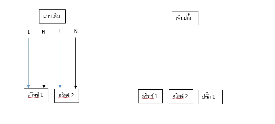 จากเดิมที่มีสวิทซ์หลอดนิออน 2 หลอดสายไฟ 2 เส้น แยกสายกันอยู่ แต่ละหลอด เป็นสวิทซ์แบบฝังผนัง