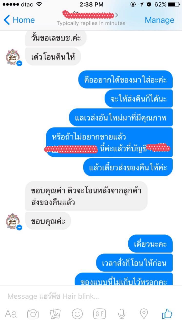 ทางร้านบอกให้เราส่งของคืนถึงจะโอนเงินคืนให้ เราก็บอกว่า "เวลาเราสั่ง เรายังโอนเงินไปก่อนเลย ทำไมคุณไม่คืนเงินเราก่อน
