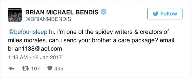 ที่น่าทึ่งไปกว่านั้นก็คือ Brian Michael Bendis หนึ่งในผู้เขียนสไปเดอร์แมนได้ติดต่อมาเพื่อขอมอบของขวัญให้กับ Styles ด้วยตัวเอง