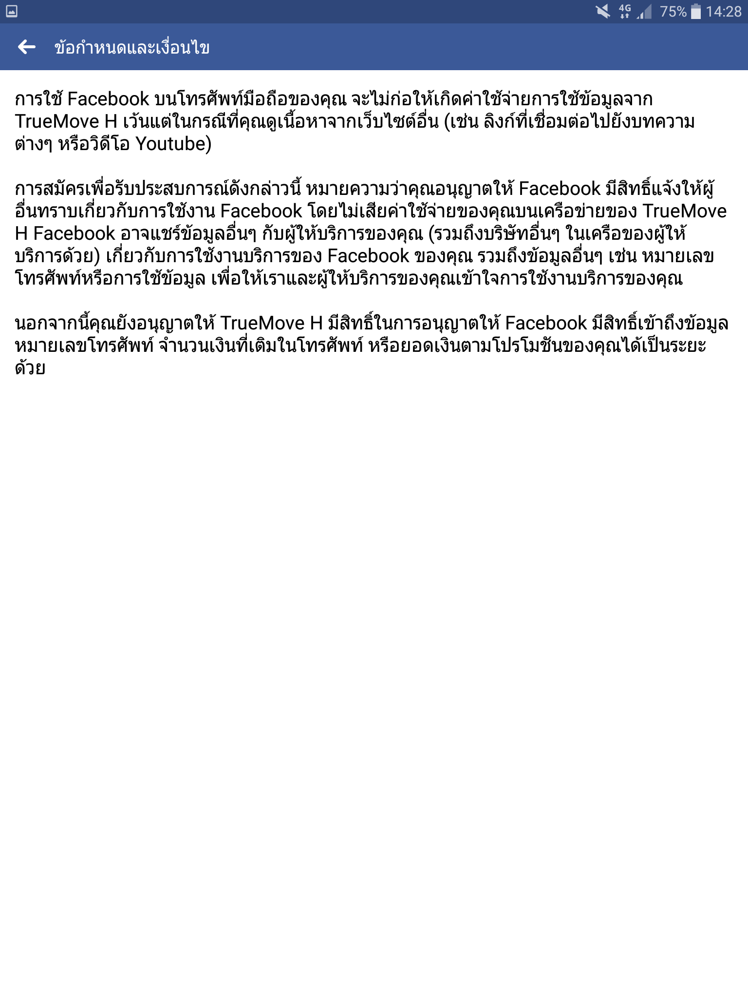 มันขึ้นเตือนมาหลายครั้ง อ่าน condition แล้วเสียววาบๆ ข้อมูลของเราทางบริษัทรวมถึงบริษัทใครเครือของเครือข่าย และ Facebook เองจะเอาไปทำอะไรบ้าง ได้เล่น FB ฟรี แต่คุ้มกับข้อมูลส่วนบุคคลที่จะเสียไปหรือเปล่า มีใครใช้ฟรีอยู่บ้าง ขอประสบการณ์