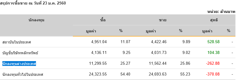 Sinthorn Summary 23/1/2560 : ต่างชาติขายสุทธิ -262.88 ลบ.