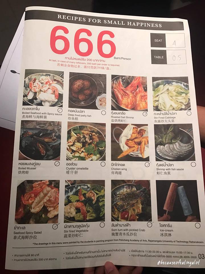 ทั้งหมดมี 24 เมนู มีทะเลลวกจิ้ม ทอดมันปลา กุ้งอบเกลือ กะหล่ำปลีผัดน้ำปลา หอยแมลงภู่อบ ออส่วน ปีกไก่ทอด กุ้งแช่น้ำปลา ยำทะเล ผักตามฤดูกาลผัดกุ้ง ส้มตำนางฟ้า หมึกผัดไข่เค็ม กรรเชียงปูผัดผงกระหรี่ หมูคำหวาน ปลากระพงทอดน้ำปลา แกงส้มเนื้อปลาทอด หอยนางรมสด น้ำพริกปูไข่ ข้าวผัดก้ามปู เกี๊ยวกุ้ง เนื้อปลาลวกจิ้ม ต้มยำทะเลน้ำข้น ลูกชิ้นปลาอินทรีย์ และของหวานเป็นไอติม (สั่งแต่พอดีนะคะ ทานไม่หมดปรับจานละ 200 บาทจ้าาาา) เยอะใช่มั้ยล่ะ จะกินกันหมดมั้ย ต้องรอดู!