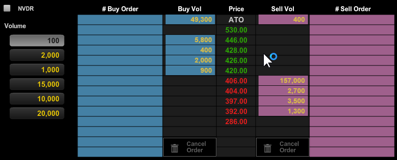 ผมเคยตั้งขาย ตามราคาที่มีคนเสนอซื้อ เช่น ตอนนี้ราคาอยู่ 406 แต่เห็นคนเสนอซื้อสูงกว่ามาก เลยเสนอขายที่ 428 แต่เปิดมาขายไม่ได้