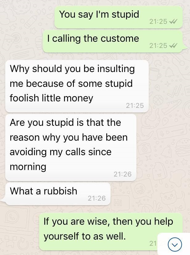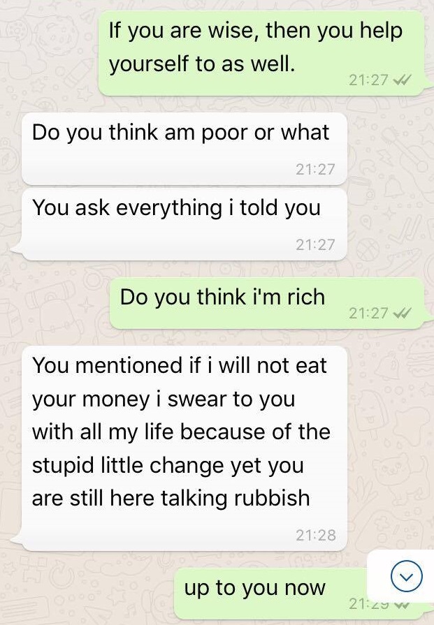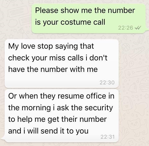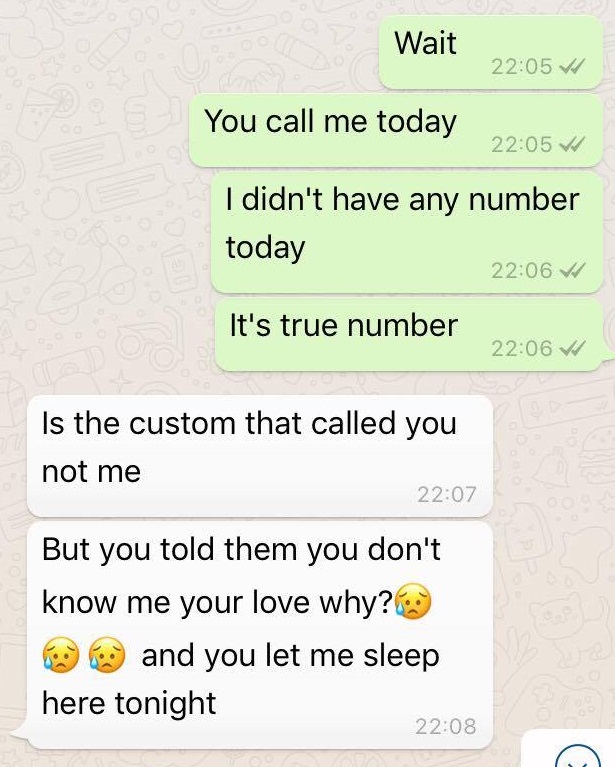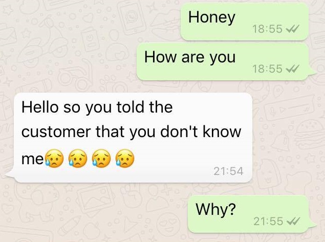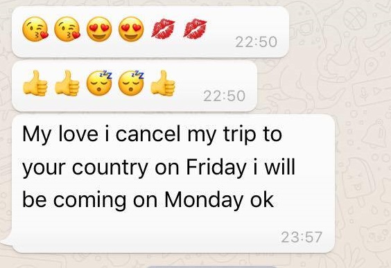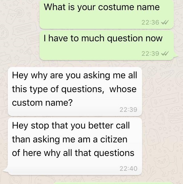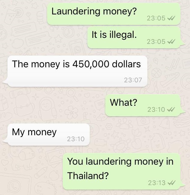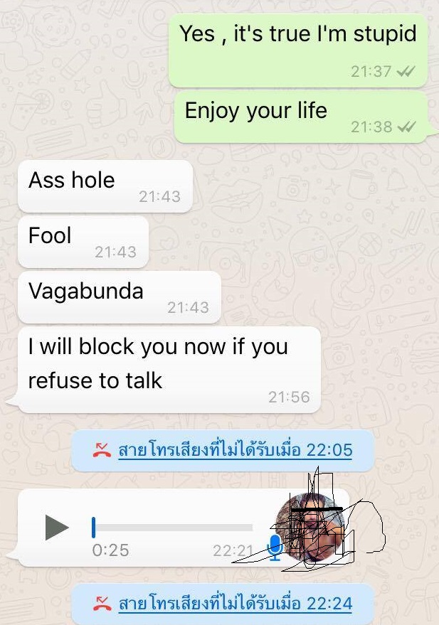 เห้ย!! คือตอนแรกเราคิดว่าพระเอกหนังporn มาคุยกับเราหรอ ตอนนั้นคิดต่างๆนาๆมากเพราะเริ่มที่จะกลัวๆนะครับ แต่ว่าผมก็เล่นด้วยนะครับ ด้วยที่ว่านางชอบเรียกผมว่า my love ผมเรียกมันกลับ honey ซึ่งตอนนั่นก็คิดว่าจะเล่นๆเฉยๆ ด้วยความที่ว่าไม่คิดอะไรมากๆคุยกับนู้นที คนนี้ที จนเราอยากเริ่มคุยกับมันจริงจังเพราะผมอยากเรียนภาษาด้วยและผมอยากทดลองภาษาของผม แต่ว่าผมก็ใช่กุเกิลแปลและตีความเอานะครับ คุยสักพักนึง มันให้เรา@ Whatapp มัน ซึงเราก็ไม่ได้เล่นด้วยความที่ตัวเองยังไงก็ได้ ก็โหลดแอปมา และเมมชื่อมันไว้
