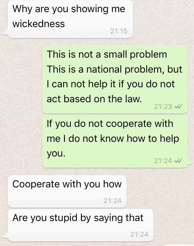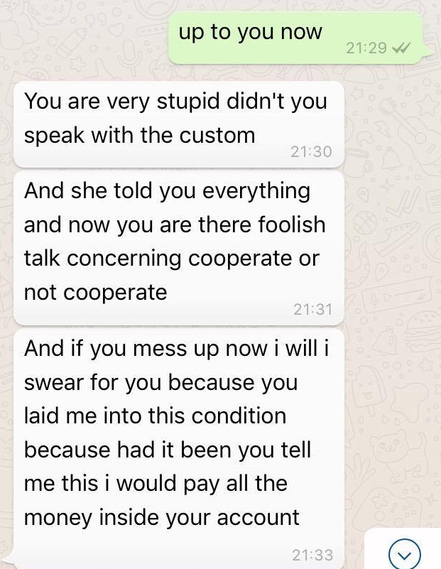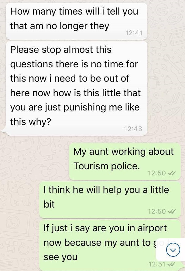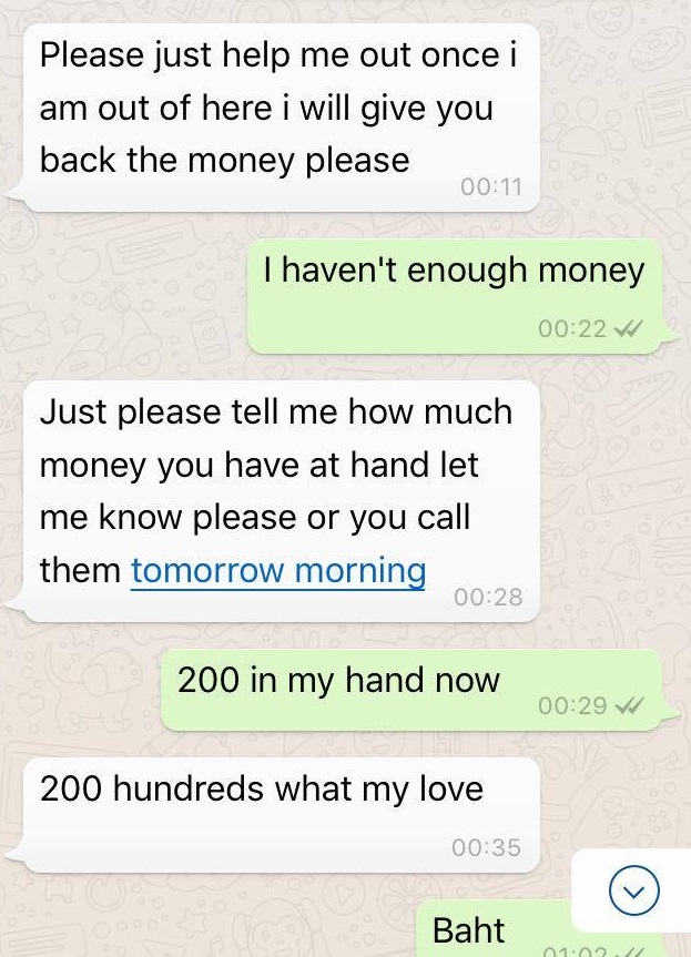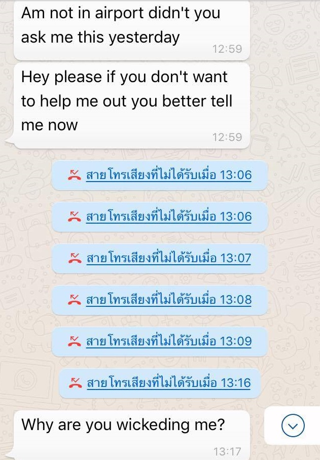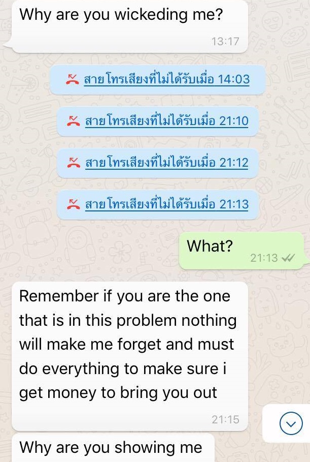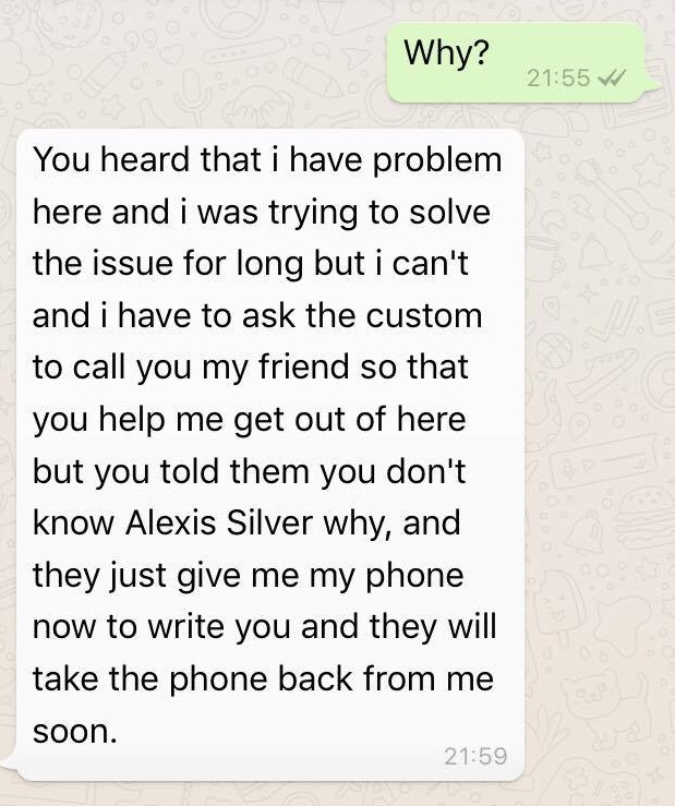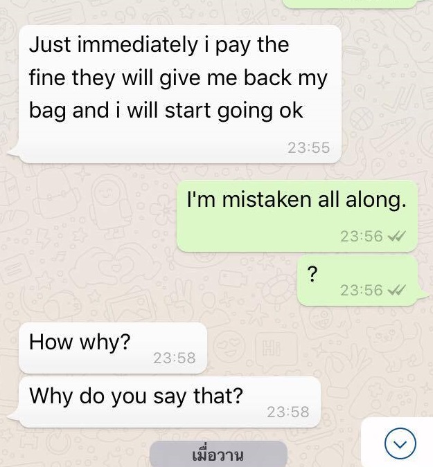 จ่ายตรงที่ตม.เลย จ่ายตรงเลยหรอยังไง คือตรงไปเลย ผมก็ตอบกลับครับ ๆ ผมก็กลับไปปรึกษาเพื่อนๆว่าโดนยังงั้นยังงี้แล้วก็เล่าเรื่องทั้งหมด เพื่อนบอกว่าโดนหลอกแน่ๆซึ่งผมตอนก็50 50 นะครับ จนวันต่อมาไอ้Alexis มันคอลแบบโทรหาผมว่าช่วยมันด้วย มันต้องเงินไปประกันตัวมัน แล้วผมถามคุณอยู่ใหนตอนนี้ มันบอกยังอยู่ที่เดิม