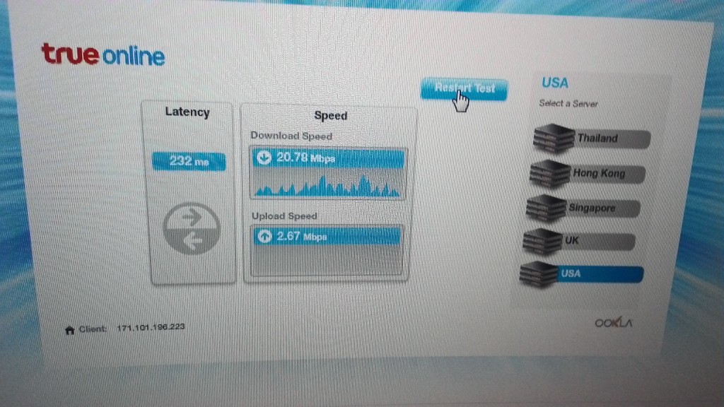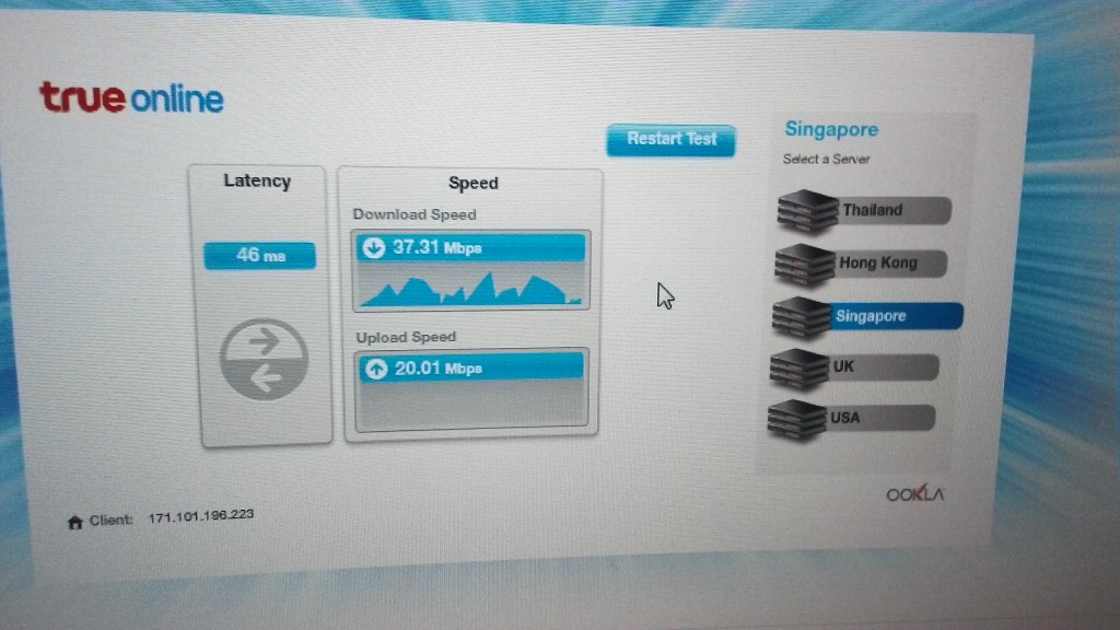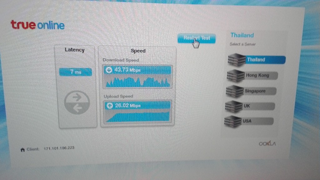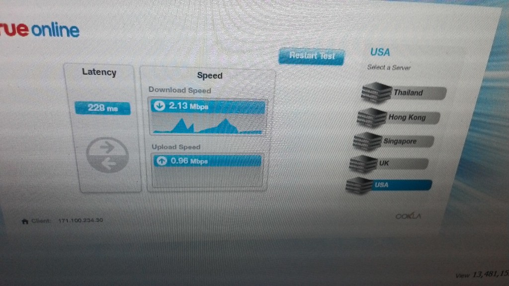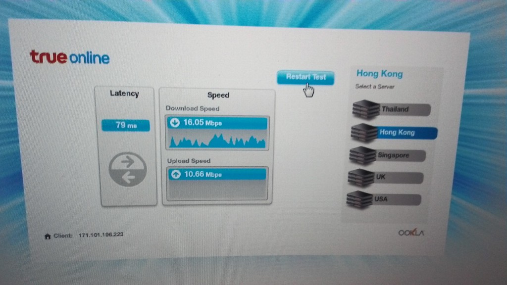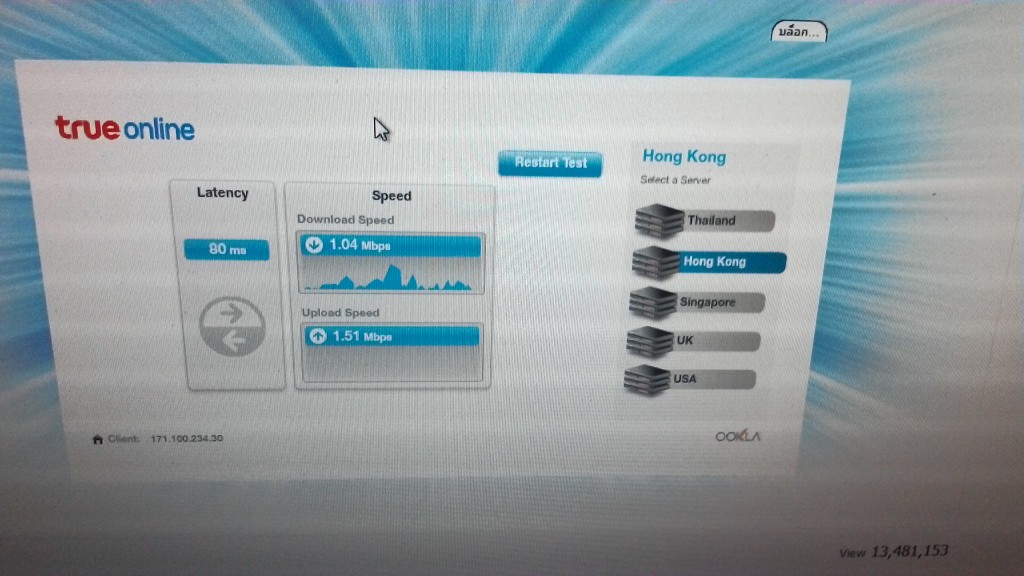 กลางคืนผมกลับมาบ้านกลายเป็นว่าอินเตอเน็ตผมช้าสุดๆ จะโหลดแพทPS4แทบไม่กระดิกเลยตรวจความเร็วพบว่าเน็ตเน่าสุดๆ  ล็อกอินเกมต่างประเทศก็ล็อกอินไม่ได้ ผมก็ขี้เกียจง่วงคิดว่าช่างจะมา10โมงก็ค่อยให้เค้าดู พอตอนเช้า10โมงช่างโทรมาบอกชุมสายผมมีปัญหาเป็นกันหลายบ้านไม่ได้เป็นที่routerเสีย ให้รอแก้1อาทิตย์ แล้ววางหูไปแล้วเน็ตก็กลับมาใช้ได้แบบเกือบปกติ แต่ที่ช่างไม่รู้คือบ้านผมติดเน็ต2เส้นครับของพี่ชายและของผมคนละเบอร์ความเร็วเท่ากันผมเลยทดสอบผลออกมาคือช่างทรูโกหกไม่อยากจะมาเปลี่ยนrouter ให้ใหม่แกล้งทำเน็ตลูกค้าเสียครับคือดูหลักฐานใด้ข้างล่างเน็ตความเร็วเท่ากันชุมสายเดียวกันกลายเป็นคนละโลกเลย ความเร็วที่เห็นนั้นคือหลังจากช่างวางสายไปตอนกลางคืนนั้นความเร็วห่วยกว่านี้อีกครับเสียดายไม่ได้ถ่ายรูปไว้