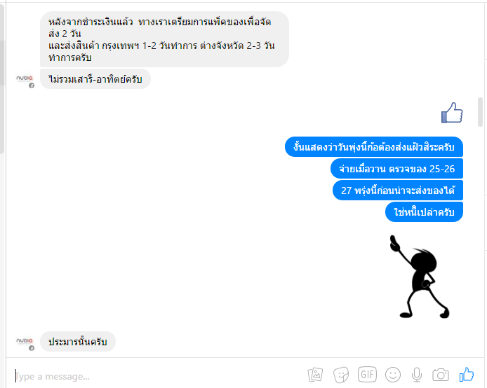สถานะการปัจจุบันตอนนี้คือ กำลังจัดแพคของอยู่ ยังไม่ได้ส่งอะไรเลย ทั้งทีบอกว่าจะส่งวันที่ 27 มกราคม ก็คือวันนี้ แล้วผมได้แจ้งไปยังในเพจนะครับ บอกว่าสินค้ากำลังออกเดินทาง ความจริงคือ ยังไม่ได้ส่งอะไรเลย แล้วมาบอกว่าสินค้าส่งมาได้ไง ตอบให้ตัวเองดูดีอ่ะ แล้วในแชทที่คุยกันนี่คนละเรื่องเลย แล้วบอกจะส่งให้วันนี้แล้วเปลี่ยนเป็นวันจันทร์อีก ไม่มีคำว่ามืออาชีพเลยครับ