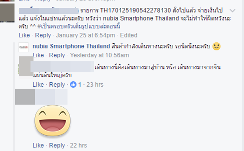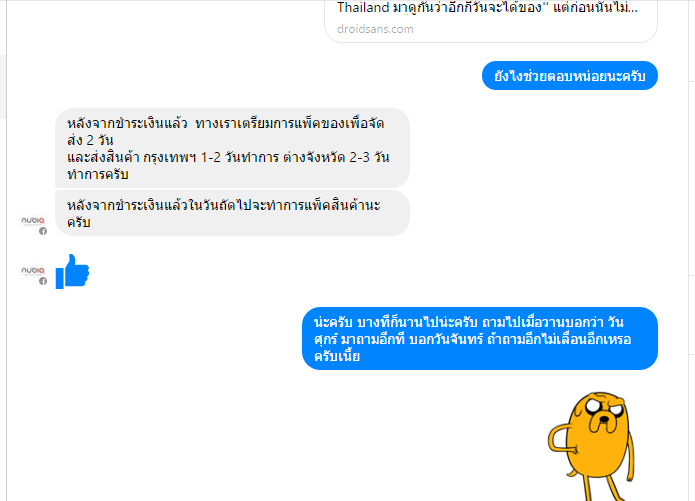 และมาตอบที่ผมคอมเม้นในเฟสบุ๊คของ Nubia Smartphone Thailand ทำนองว่าสินค้ากำลังเดินทางตอบแบบนี้ทำไม ตอบให้คัวเองดูดีเหรอ ทั้งทีตัวเองยังไม่ได้ส่งของอะไรให้คนอื่นเลย เรื่องตอบให้ตัวเองดูดียกให้อันหนึ่งเลยนะครับ ของยังไม่ได้ส่งมาบอกสินค้ากำลังเดินทาง น่าอายนะครับ