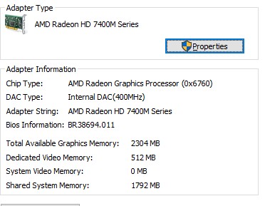 Processor: Intel(R) Core(TM) i5-2430M CPU @ 2.40GHz 2.40GHz RAM: 4GB 64bit Display AMD Radeon HD 7400M series Intel(R) HD Graphics 3000