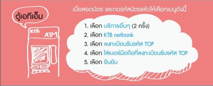 2.ตู้ ATM/ADM โดยลงทะเบียนหมายเลขโทรศัพท์มือถือเพื่อขอรับรหัส TOP