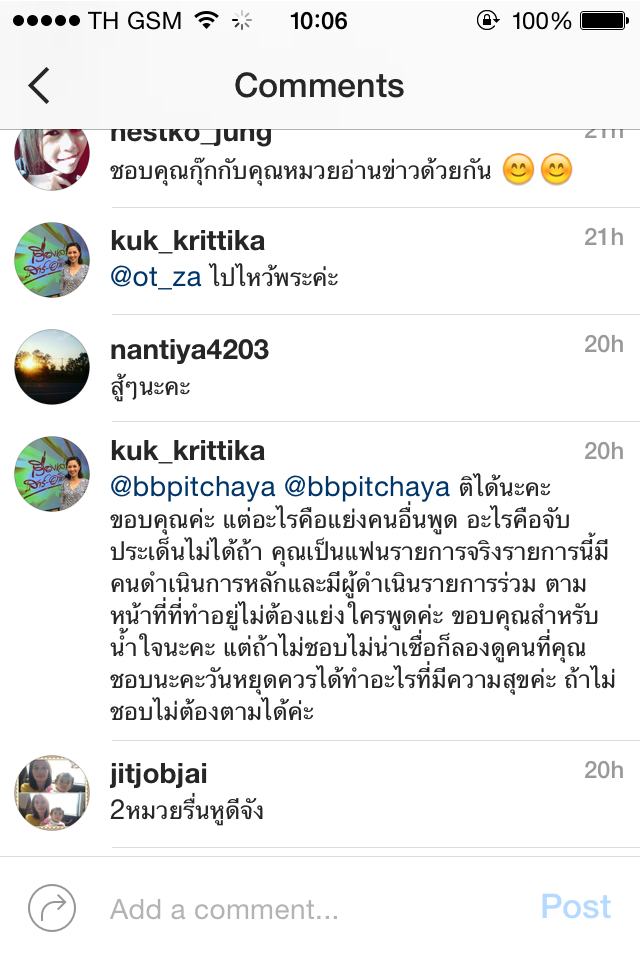 มีแฟนรายการมาคอมเม้นวิจารณ์ในigคุณกุ๊กว่าแย่งคนอ่านข้างๆอ่าน คุณกุ๊กเลยชี้แจงตามในภาพ