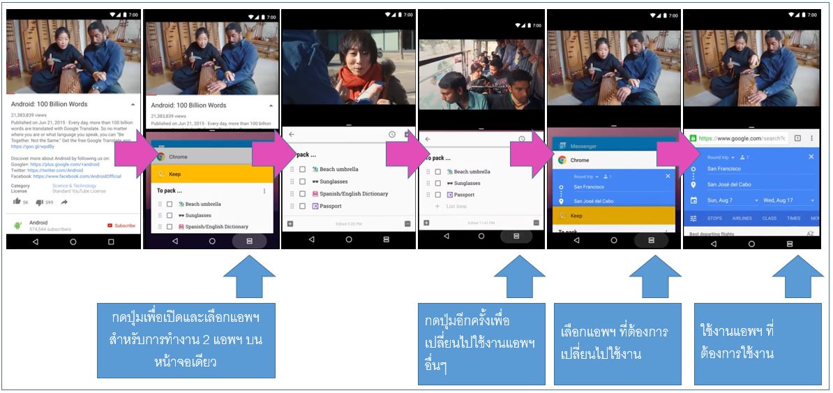 คุณสามารถแบ่งหน้าจอออกเป็น 2 ส่วนเพื่อการใช้งาน 2 แอพพลิเคชั่นพร้อมกันได้ อย่างเช่น ครึ่งจอบนคุณเปิดดูคลิปวิดีโอจากยูทูบ ส่วนครึ่งจอล่างก็สามารถตอบอีเมล์ไปพร้อมๆ กันได้ ในขณะเดียวกัน คุณก็สามารถเปลี่ยนไปใช้แอพฯ อื่นๆ สำหรับครึ่งจอล่างได้อย่างสะดวก
