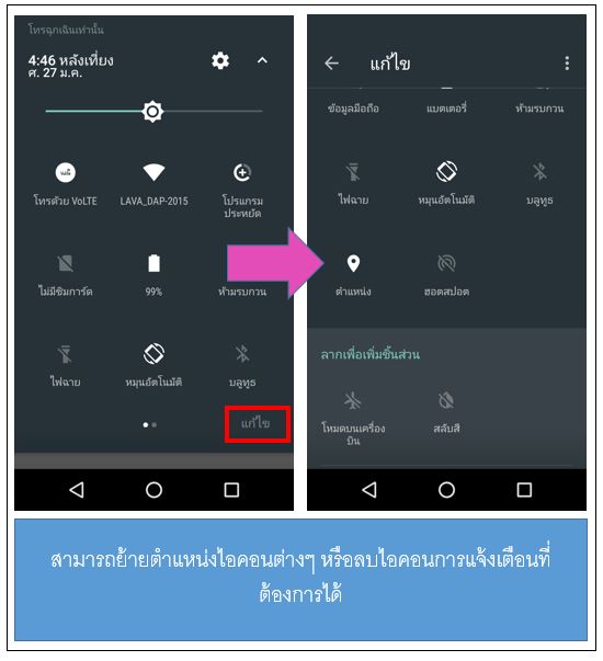 เพียงกดที่ปุ่ม “แก้ไข” หรือ “Edit” ที่มีตรงที่การตั้งค่าด่วน สามารถตั้งค่าการใช้งานไอคอนการตั้งค่าด่วนต่างๆ ได้ตามที่คุณต้องการ ไม่ว่าจะเป็นการเพิ่ม ลด จำนวนไอคอน หรือย้ายตำแหน่งไอคอนก็ตาม