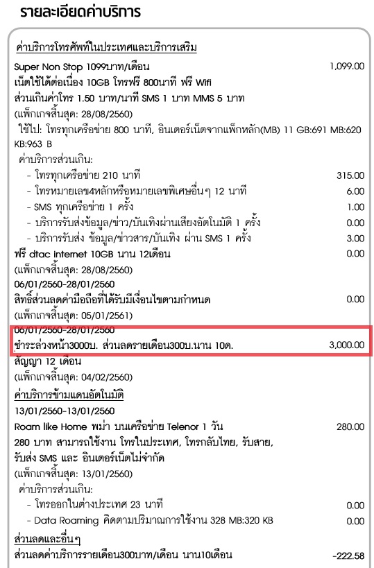 ผมจึงได้ไปเช็ครายละเอียดการใช้งานของเดือนที่แล้วปรากฏว่าผมเจอค่าใช้บริการที่ทำให้ค่าใช้จ่ายเดือนนี้ผิดปกติขึ้นมานั่นคือค่าบริการชำระล่วงหน้าจำนวน 3,000 บาท ซึ่งรายการนี้เกิดจากการที่ผมซื้อมือถือและใช้โปรลดราคาเครื่องทำให้ผมต้องจ่ายค่าบริการล่วงหน้า3000บาทโดยจะนำไปใช้ลดค่าบริการรายเดือนๆละ300บาทเป็นจำนวน10เดือน
