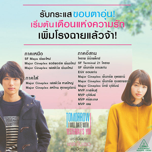 ประกาศ!!! รายชื่อโรงหนังฉายเครือ เมเจอร์ ซีนีเพล็กซ์ เรื่อง "Tomorrow I will date with Yesterday's You"