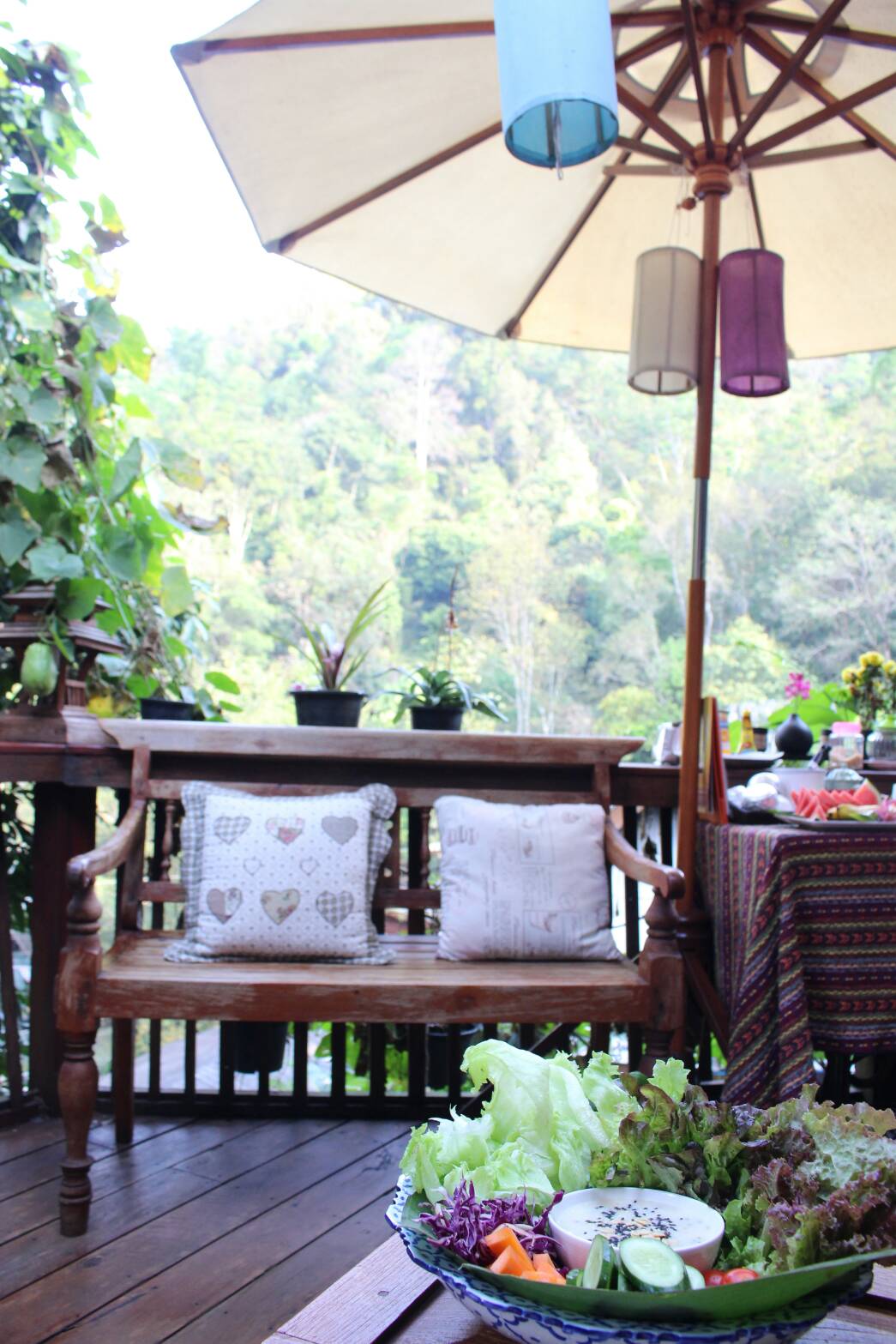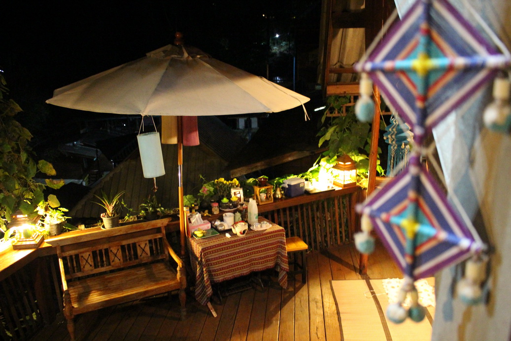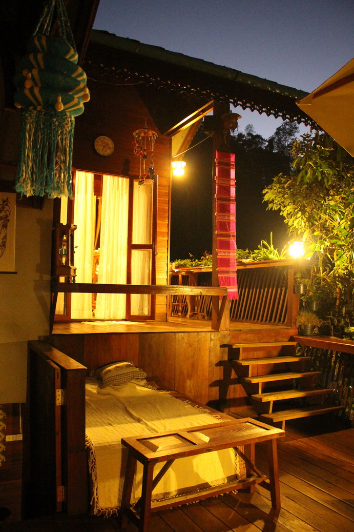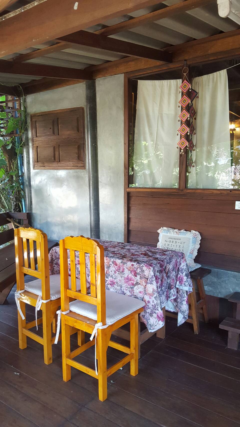 ระเบียง สำหรับนั่งชิวบรรยากาศ ระเบียงอีกฝั่งหนึ่งของห้อง จะเป็น ที่นอนและที่พักเอนกายแบบชาวเหนือ ที่ ดูโปร่งและโล่งสบาย ที่พักที่นี่มีทั้งหมด 3 ห้อง ชั้น 3 ชั้น 2 และชั้น 1