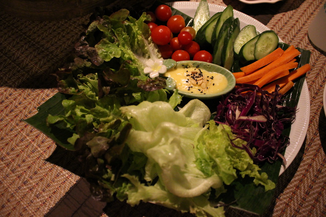 เริ่มที่เซตแรก ผักสลัด ดูธรรมดา แต่ความสดของผัก ที่ 16 องศาเซลเซียส ทำให้ผักทั้งสด กรอบ หวานอร่อยมากทีเดียวครับ ประกอบกับน้ำสลัดที่เจ้าของปรุงเอง ทำให้กินผักหมดทุกชนิดไม่มีเหลือเลย
