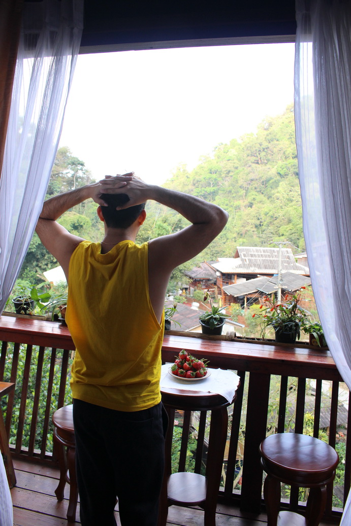 เมื่อเราเข้าไปในบ้าน (ชาวบ้านตะลุยพาเข้าบ้านเลยครับ) อาจารย์เจ้าของบ้าน ก็ตกใจ บอกว่าไม่คิดว่าจะมีแขกมาพัก เพราะไม่ได้ดูใน booking และ ไม่ได้ติดโทรศัพท์เอาไว้กับตัว เนื่องจากทำความสะอาดบ้านอยู่ (ผมมาถึงบ่ายโมงบ่ายสองโมงประมาณนี้ แต่ผมจองที่พักตอน 10โมงเช้าครับ) แต่สิ่งที่ทำให้ผม ดีใจมากๆ นั่นคือ บรรยากาศของสถานที่และวิวทิวทัศน์ที่มองออกไป จากระเบียงห้อง บอกเลยครับว่า มันเป็นมุมและวิวที่ที่สวยงามมาก และได้บรรยากาศของการพักผ่อนอย่างเต็มที่เพราะห้องผมอยู่ชั้น3 ไม่มีบ้านอื่นบังเลยครับ