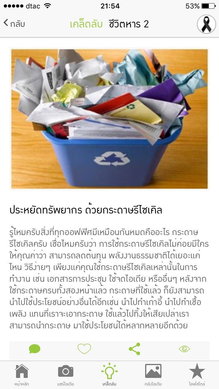 พอเข้าไปดู ก็จะเห็นบทความสั้นๆ แต่มีเนื้อหาสาระดีๆ แบบนี้ อย่างเรื่องนี้ให้ความรู้เรื่องกระดาษ ที่เป็นได้มากกว่ากระดาษ Reuse ที่ใช้เขียนทั้ง 2 ด้าน แต่กลับไม่เอาของพวกนี้ไปชั่งกิโลขาย แต่ว่านำมารีไซเคิลเป็นเก้าอี้แทน ทรัพยากรไม่สูญหาย แถมยังได้ของใช้เพิ่มอีกต่างหาก