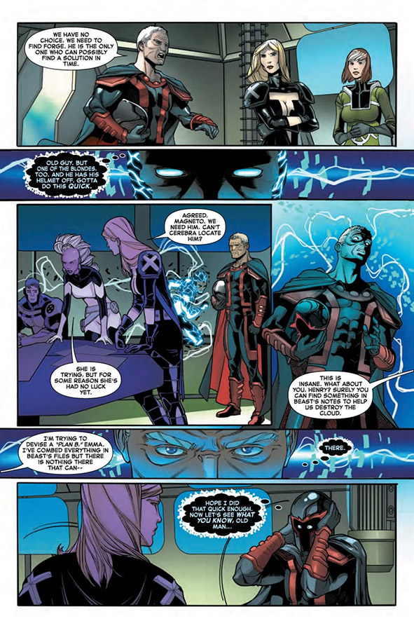 โมเสกลอบเข้ามาในเกาะมูร์ ซึ่งพวกเอ็กซ์เมนกำลังปรึกษาว่าจะจัดการหมอกที่เหลือยังไง มีแต่ต้องหาตัวฟอร์เก้เท่านั้นล่ะมั้ง โมเสกพยายามเลี่ยงไม่เผลอเข้าสิงผู้หญิงผมบลอนด์ (เอมม่า) แล้วหาตาแก่ที่มีหมวก (แม็กนีโต้) อ้อ นั่นเอง เข้าสิงปุ๊บรีบใส่หมวกให้ไวเลย เดี๋ยวเอมม่าจับได้ (มีหันมามองด้วยแน่ะ)