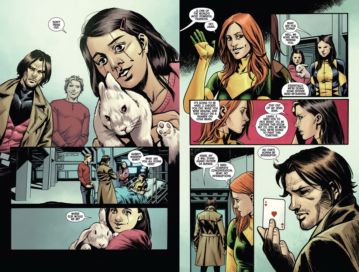 ลอร่าฟื้นมาในเซฟเฮาส์ของ Tyger Tiger พบว่าแก็บบี้ วอร์เรน แกมบิท และจีนเกรย์เฝ้าอยู่ ได้เวลาลบล้างจิตที่ตอบสนองกับ trigger scent ออกจากหัวเธอแล้ว