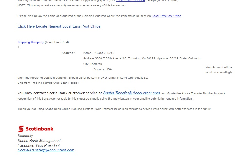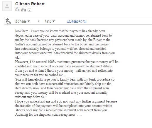 ตอบเมล์เร็วมาก เหมือนอยากได้อย่างแรง พอสรุปราคาให้เค้าก็บอกจะรีบโอนให้เลย พอมาวันนี้เมล์จากแบงก์ Scotiabank ส่งเมล์มาหาเราแล้วบอกให้ส่งของและส่งหลักฐานการส่งแล้วเงินจะตัดเข้าบัญชีของเรา