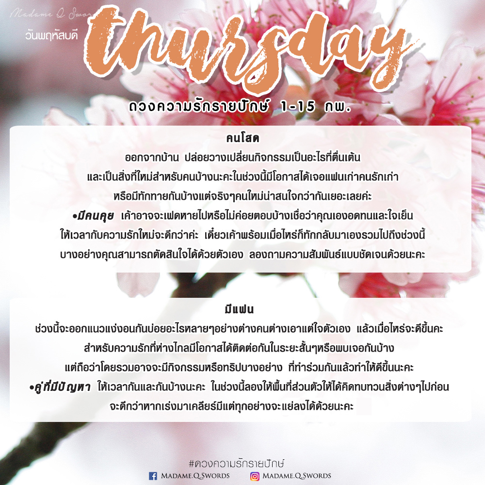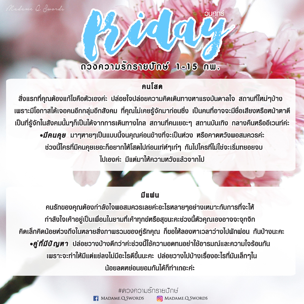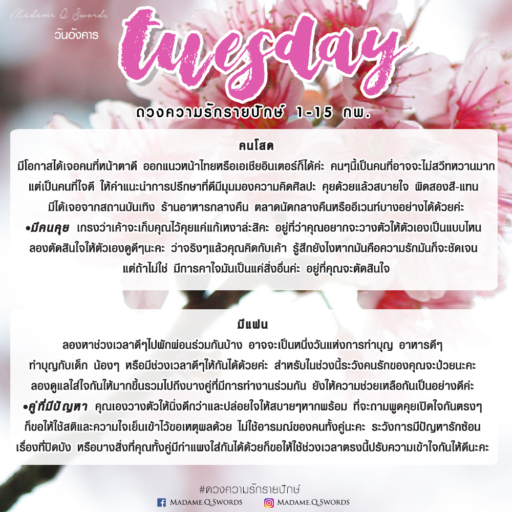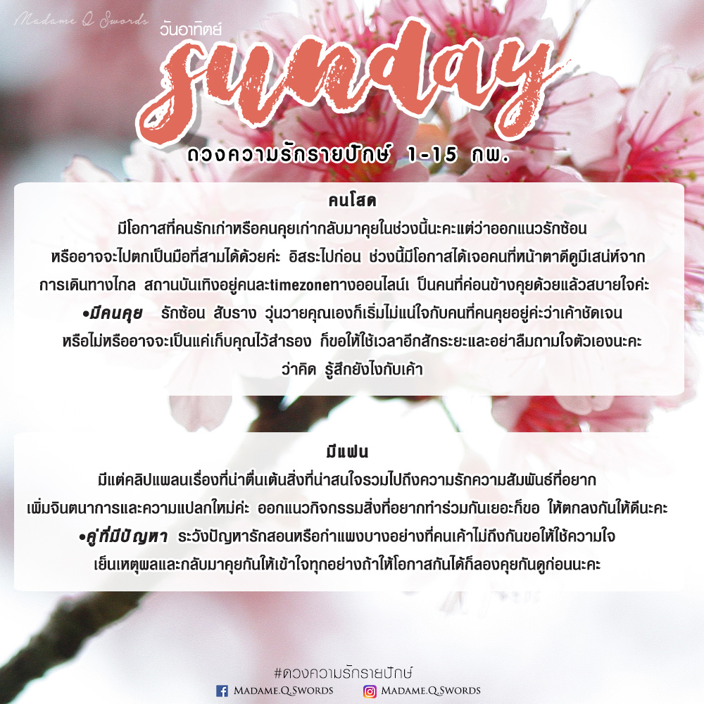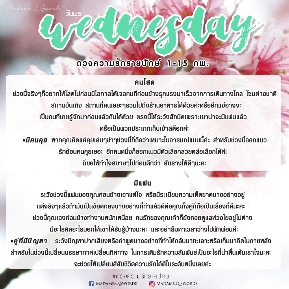 ดวงความรักรายปักษ์ 1-15กุมภาพันธ์ by แพร madame q swords มาแล้วค่าาา อัพเดททันวาเลนไทน์กันเลยทีเดียว มาอ่านกันค่ะ^^ วิธีอ่าน -ไม่มีแยกพุธกลางวันกลางคืน นับแบบสากลค่ะ ติดตามงานเขียนอื่นๆ ย้อนหลังได