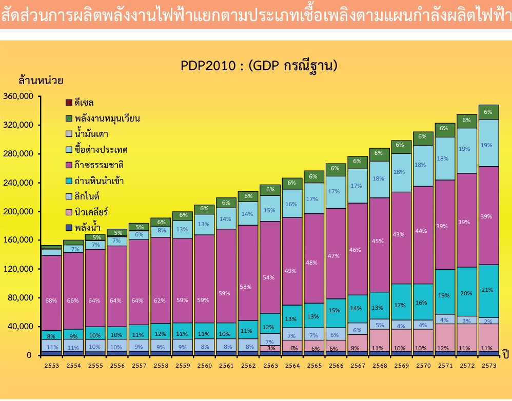 จากรูปภาพจะพบว่าในอนาคตประเทศไทยมีความต้องการที่จะซื้อพลังงานไฟฟ้าจากต่างประเทศที่เพิ่มขึ้นและพบว่ากระบวนการผลิตไฟฟ้าส่วนใหญ่มาจากการใช้พลังงานจากก๊าสธรรมชาติซึ้งถ้ามองด้านความมั่นคงทางพลังงานแล้วนั้นเป็นไปในทิศทางที่ไม่ดีนัก