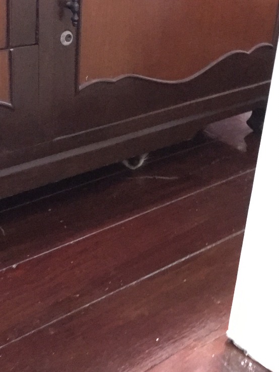 หลังจากเข้าไปอยู่บ้านใหม่ แม่แมวยังไม่ยอมให้เจ้าของใหม่จับตัว จะซุกใต้เตียงตลอดแบบนี้