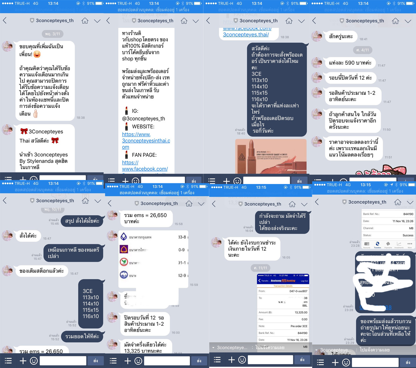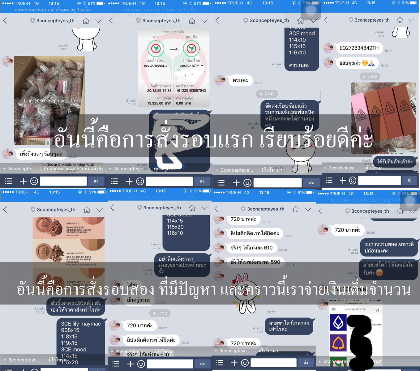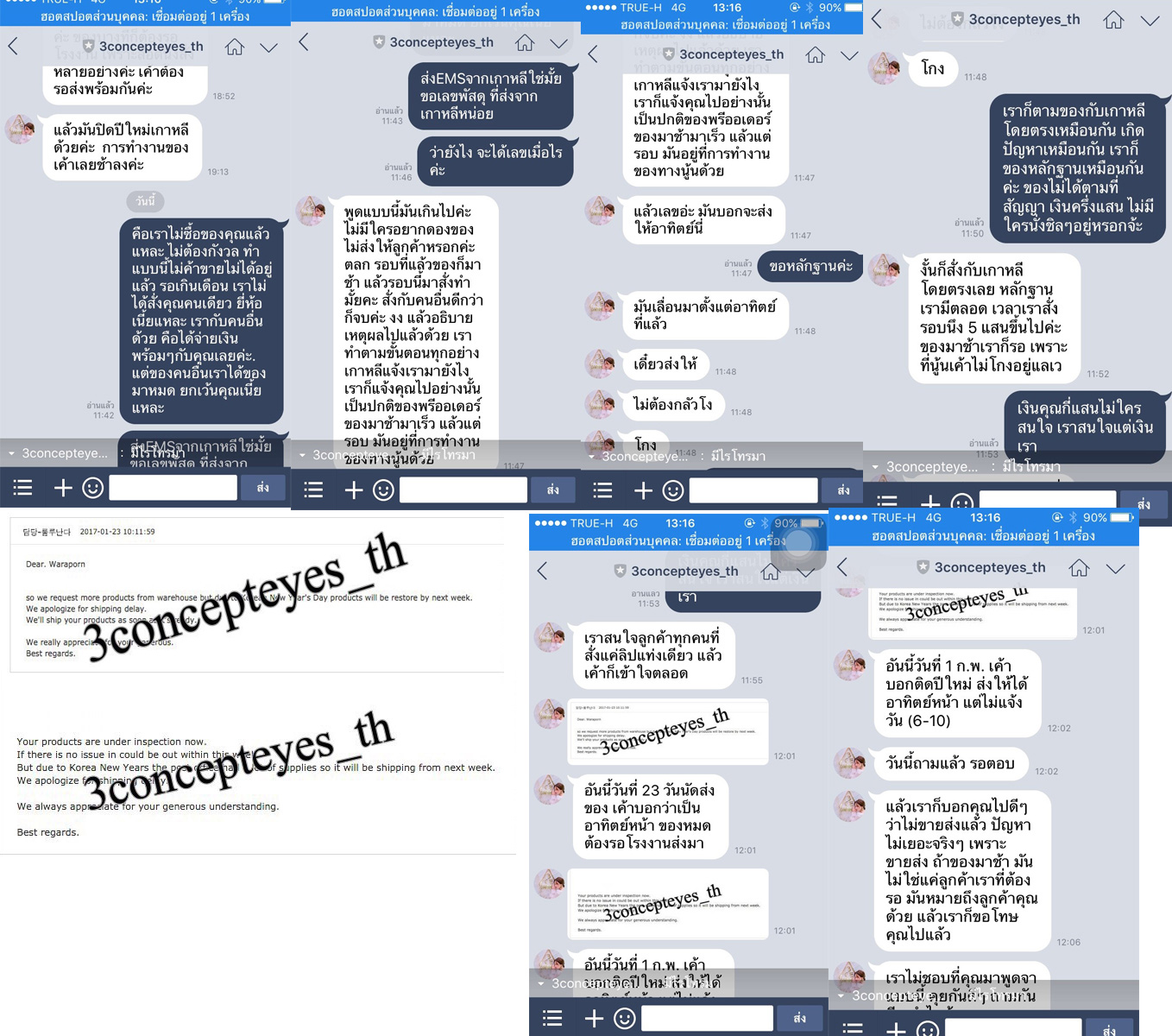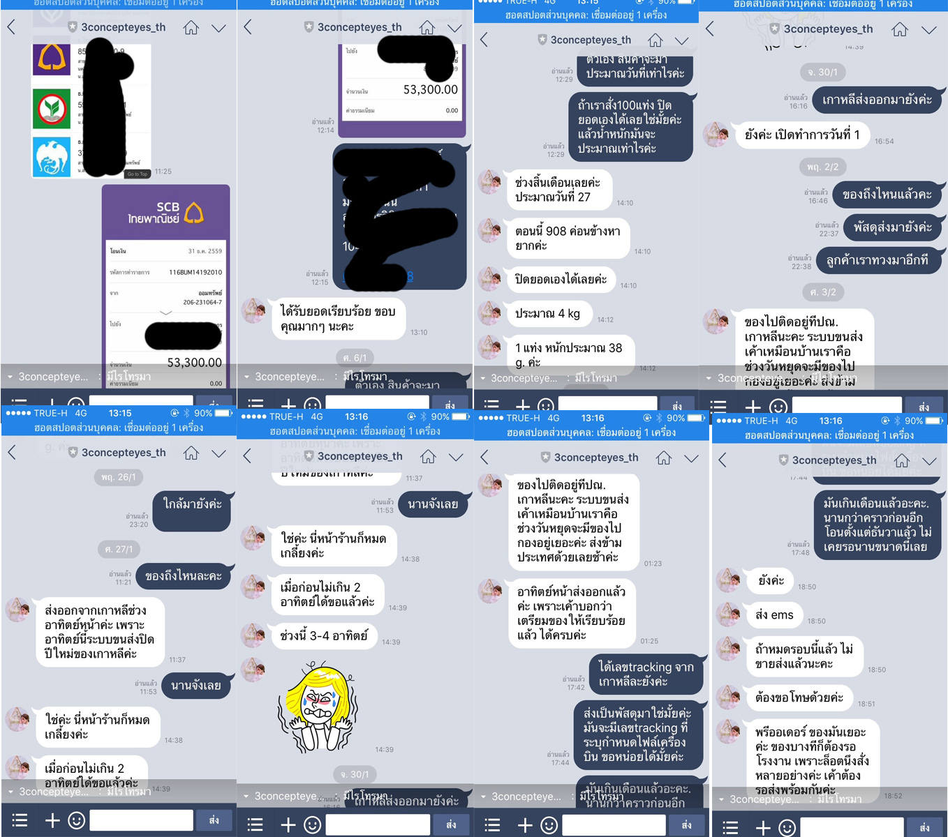 คือเราเคยลองสั่งครั้งแรกจ่ายเงินแบบมัดจำ50%มาแล้ว ก็ล้าช้าเพราะของหมด แต่สุดท้ายก็ได้ครบค่ะ เลยไว้ใจซื้อครั้งที่2ที่นี่เราจ่ายเต็มจำนวนประมาณ5หมื่นกว่าบาทตั้งแต่31ธันวา แต่คราวนี้วันนี้วันที่7กุมภา แม่ค้าบล็อกไลน์เราแล้วก็บอกให้ไปแจ้งความเลย ให้ตำรวจโทรมา อยากปรึกษาหน่อยว่า มีใครเคยเจอประสบการณ์แบบนี้มั้ยค่ะ แล้วทำอย่างไรดี คือเราผิดอะไร ในเมื่อเค้าบอกว่า สินค้า จะได้2-3สัปดาห์ ตอนนี้จะ6สัปดาห์แล้วค่ะ แล้วบล็อกไลน์เรา คือไม่เข้าใจ ร้านก็ดูน่าเชื่อถือดีค่ะ แต่ดูแลลูกค้าแบบนี้ ตามที่เห็นในchat ค่อนข้างเครียดมากกก เพราะเงินเป็นจำนวนเยอะ แล้วจ่ายไปตั้งแต่ธันวา ไม่ได้รับสินค้าอะไรเลย คือถ้าไม่ทวง ไม่ขอหลักฐานก็ไม่อัพเดตอะไรให้เราทราบเลย คิดว่ากำลังจะรวบรวมหลักฐานแล้วไปแจ้งความได้มั้ยค่ะ เพราะเค้าเป็นคนที่ผิดสัญญา และประโยคสุดท้ายคือ สินค้าไม่มี สินค้าไม่เข้า สั่งมา8แสน ได้1ใน5 แล้วก็บล็อกเราเลย สรุปคือมีสินค้า หรือว่าไม่มี ทั้งๆที่ตอนแรกเหมือนกับบอกว่า สินค้าอยู่ที่ปณ.เกาหลีเรียบร้อย แค่ติดวันหยุดเท่านั้น รูปเยอะหน่อยนะคะ เพราะว่าเค้าท้ามาให้แคปมาเล่าให้หมด ปรกติก็ไม่เจออะไรแบบนี้นะคะ เพิ่งมีครั้งแรกที่โดนท้าให้แจ้งความ แล้วคำพูดก็งงๆ ภาพเรียงจากซ้ายไปขวานะคะ