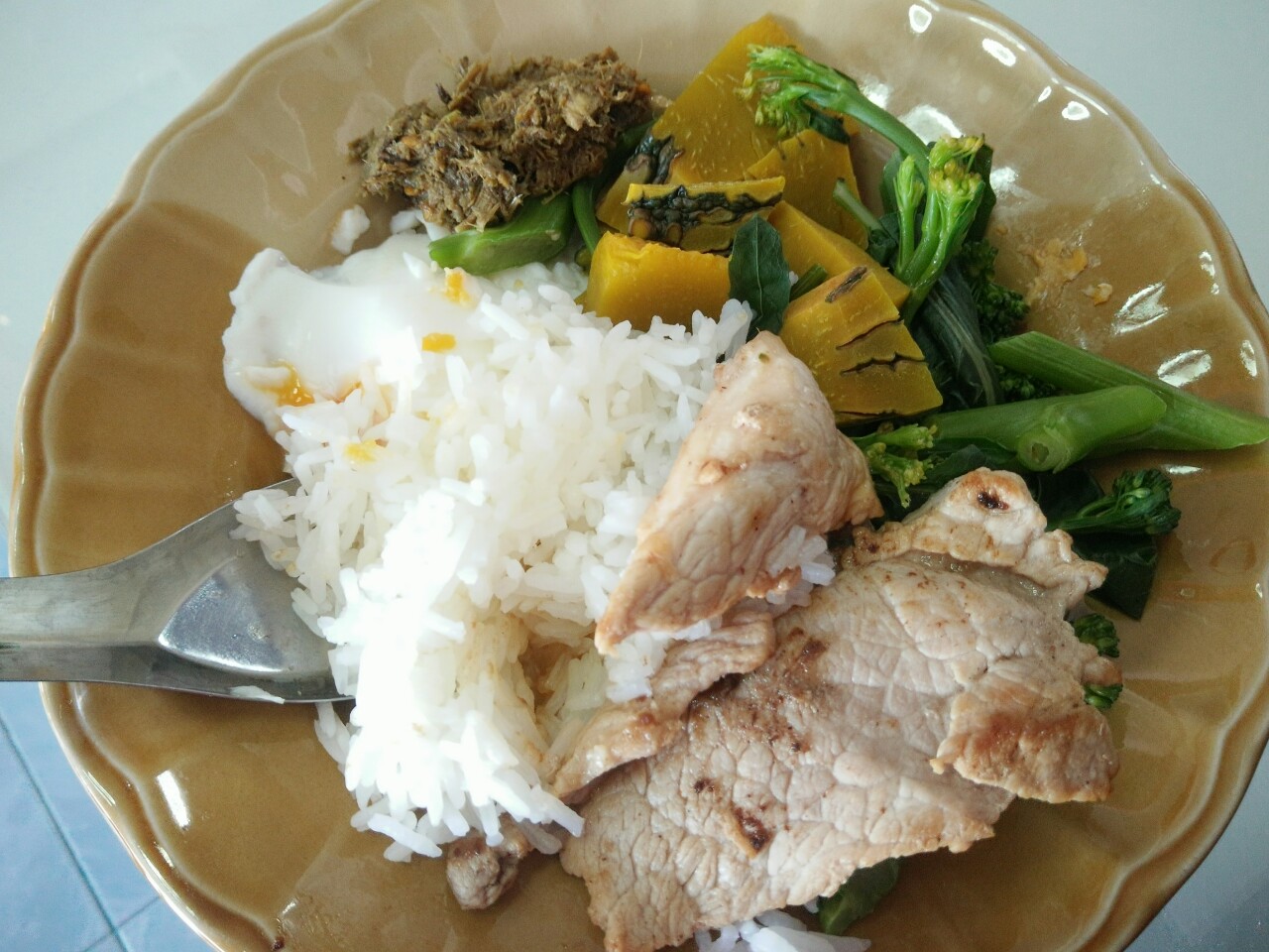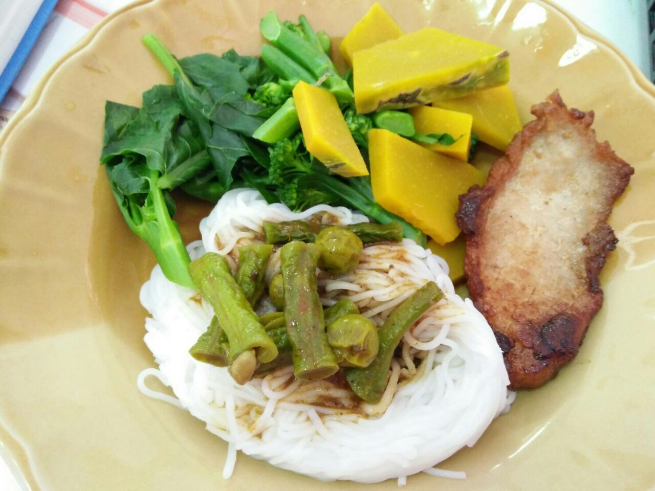 มื้อเที่ยง 12.00 น. ขนมจีน 1 ส่วน + ยอดบล็อคโคลี่และฟักทองต้ม + หมูเนื้อแดงทอด 1 ชิ้น (แอบจิ๊กของภรรยามา แต่เค้าทอดน้ำมันนะครับ)