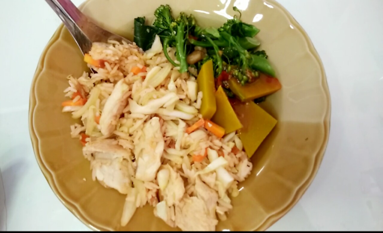 มื้อเย็น 16.30 น. ข้าวผัด 2 ทัพพี .ใส่อกไก่ แครอท กะหล่ำปลี หอมหัวใหญ่ + ยอดบล็อคโคลี่และฟักทองต้มราดน้ำสุกี้