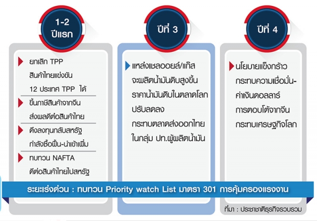 1) การยกเลิกการทำความตกลงหุ้นส่วนยุทธศาสตร์เศรษฐกิจภาคพื้นแปซิฟิก (TPP) และหวนกลับมาเจรจาความตกลงการค้าเสรีระดับทวิภาคีแทน จะส่งผลดีกับการส่งออกสินค้าไทยสามารถแข่งขันกับสินค้าของ 12 ประเทศสมาชิก TPP ได้