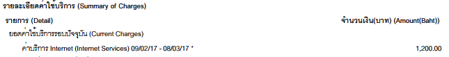 สวัสดีครับ รอบบิลของพ่อผมคือ วันที่ 9 - 8 แล้ววันนี้(วันที่ 8/02/17) พ่อไปปรับลดแพ็กเกจจาก 200/50 เป็น 100/30 ในราคา 900 ครับ แต่พอมาเช็คในใบแจ้งค่าบริการ ปรากฏว่าได้จ่ายล่วงหน้าไปแล้ว (ค่าบริการ Internet (Internet Services) 09/02/17 -08/03/17 (1,200 บาท))